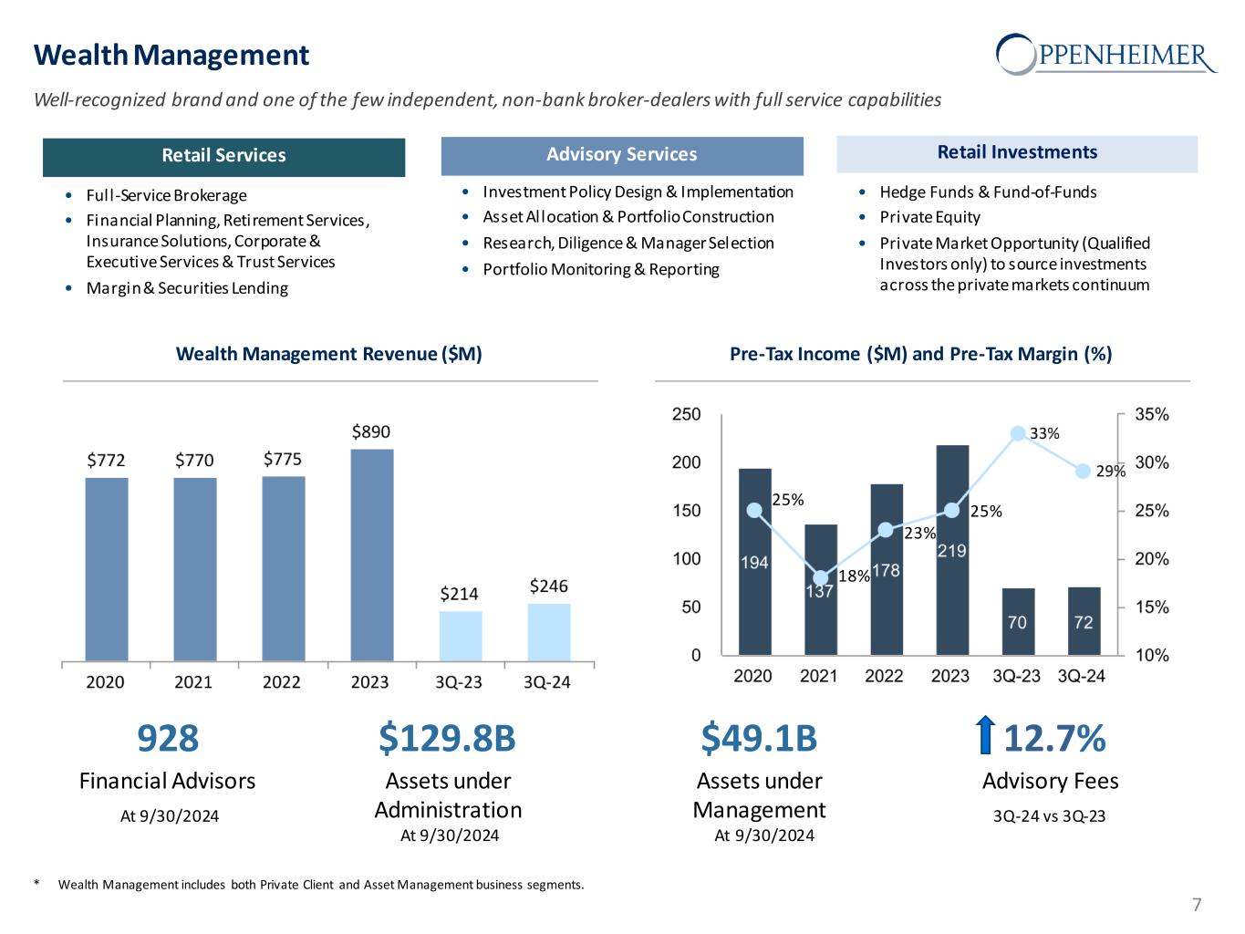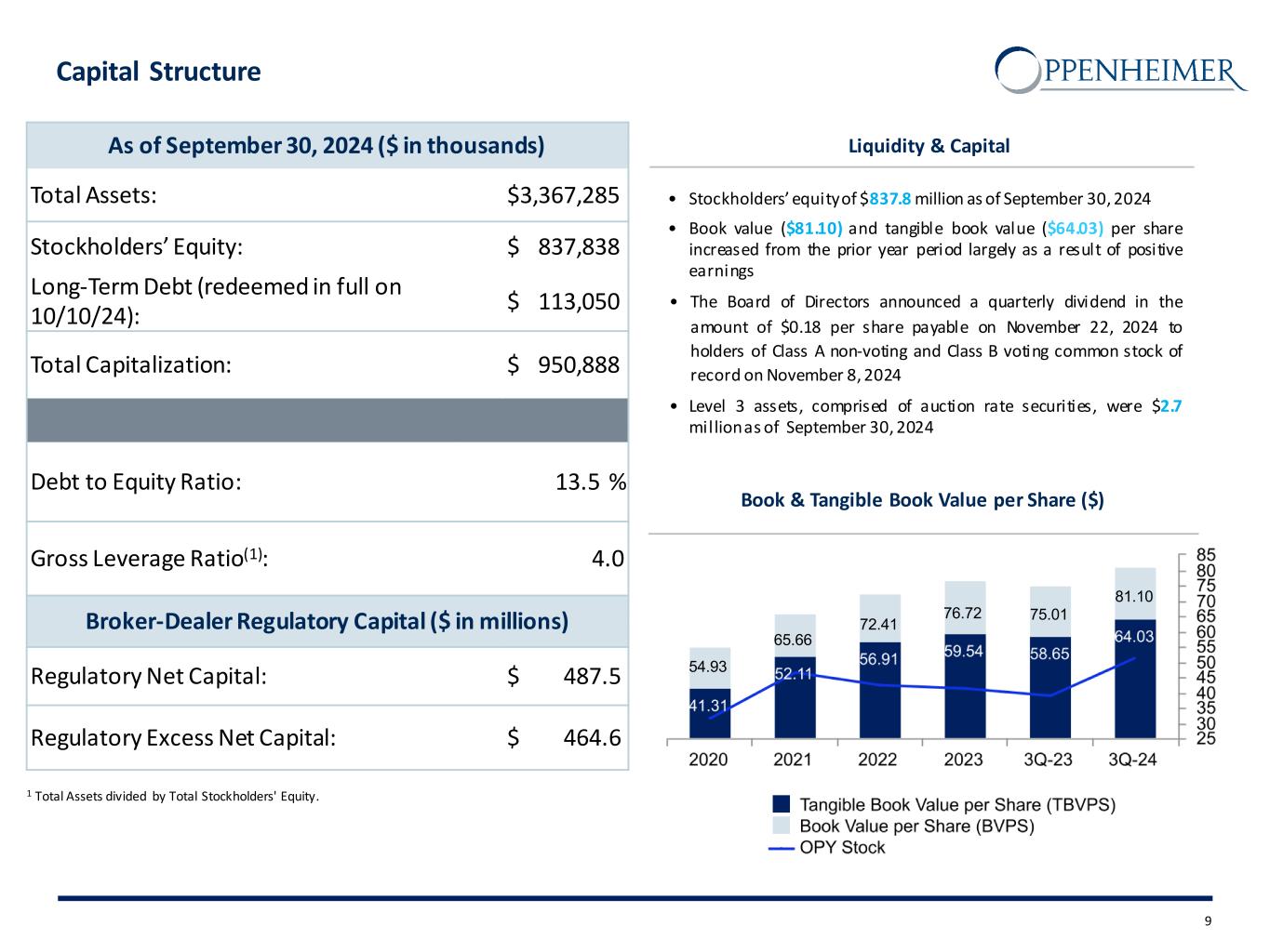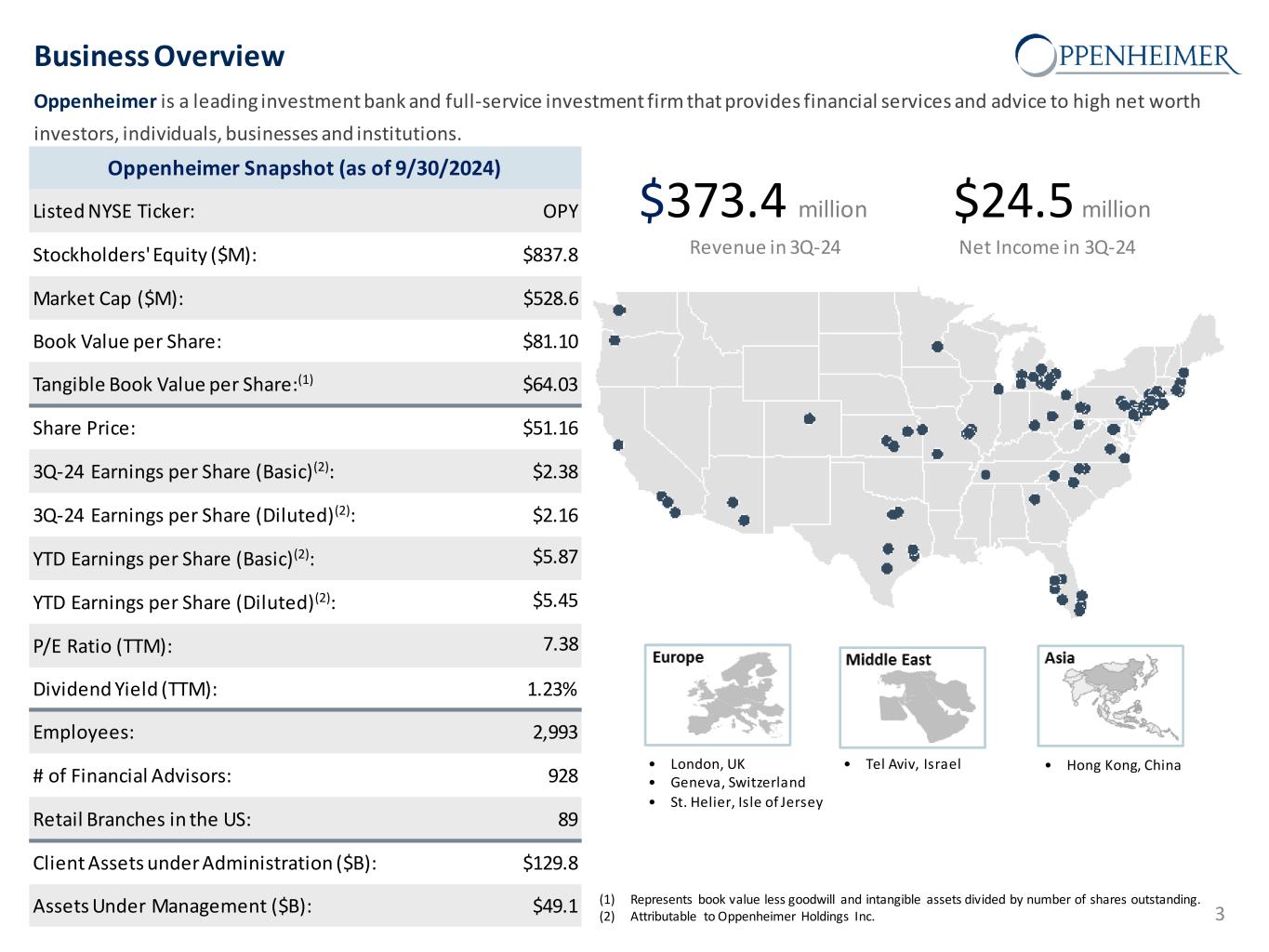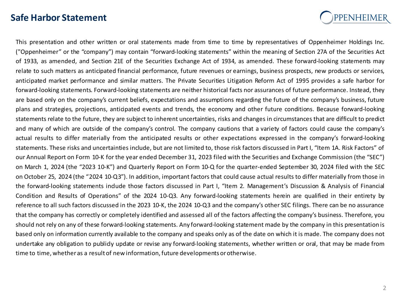 Safe Harbor Statement This presentation and other written or oral statements made from time to time by representatives of Oppenheimer Holdings Inc. ("Oppenheimer” or the “company”) may contain “forward-looking statements” within the meaning of Section 27A of the Securities Act of 1933, as amended, and Section 21E of the Securities Exchange Act of 1934, as amended. These forward-looking statements may relate to such matters as anticipated financial performance, future revenues or earnings, business prospects, new products or services, anticipated market performance and similar matters. The Private Securities Litigation Reform Act of 1995 provides a safe harbor for forward-looking statements. Forward-looking statements are neither historical facts nor assurances of future performance. Instead, they are based only on the company’s current beliefs, expectations and assumptions regarding the future of the company’s business, future plans and strategies, projections, anticipated events and trends, the economy and other future conditions. Because forward-looking statements relate to the future, they are subject to inherent uncertainties, risks and changes in circumstances that are difficult to predict and many of which are outside of the company’s control. The company cautions that a variety of factors could cause the company’s actual results to differ materially from the anticipated results or other expectations expressed in the company’s forward-looking statements. These risks and uncertainties include, but are not limited to, those risk factors discussed in Part I, “Item 1A. Risk Factors” of our Annual Report on Form 10-K for the year ended December 31, 2023 filed with the Securities and Exchange Commission (the “SEC”) on March 1, 2024 (the “2023 10-K”) and Quarterly Report on Form 10-Q for the quarter-ended September 30, 2024 filed with the SEC on October 25, 2024 (the “2024 10-Q3”). In addition, important factors that could cause actual results to differ materially from those in the forward-looking statements include those factors discussed in Part I, “Item 2. Management’s Discussion & Analysis of Financial Condition and Results of Operations” of the 2024 10-Q3. Any forward-looking statements herein are qualified in their entirety by reference to all such factors discussed in the 2023 10-K, the 2024 10-Q3 and the company’s other SEC filings. There can be no assurance that the company has correctly or completely identified and assessed all of the factors affecting the company’s business. Therefore, you should not rely on any of these forward-looking statements. Any forward-looking statement made by the company in this presentation is based only on information currently available to the company and speaks only as of the date on which it is made. The company does not undertake any obligation to publicly update or revise any forward-looking statements, whether written or oral, that may be made from time to time, whether as a result of new information, future developments or otherwise. 2