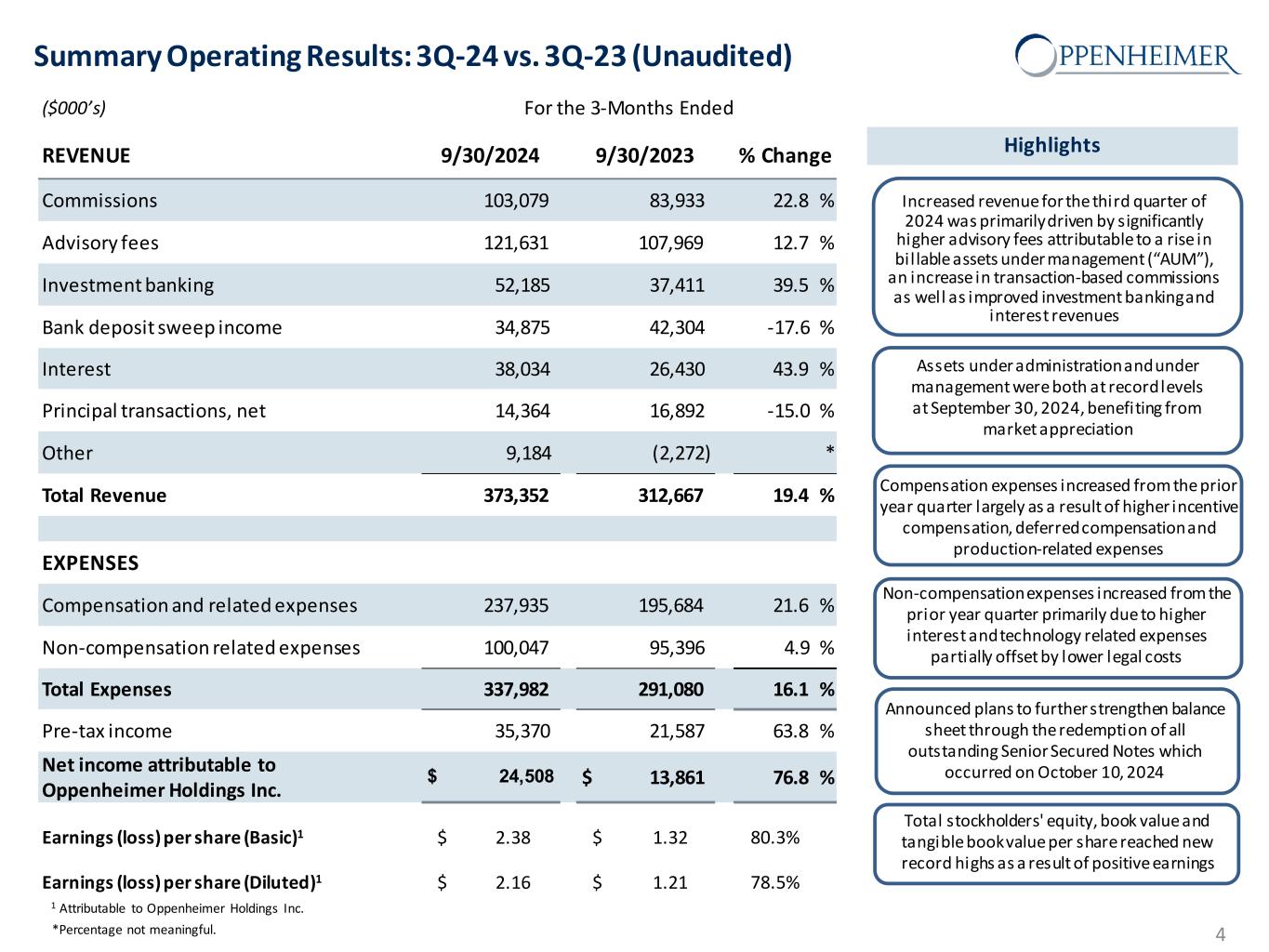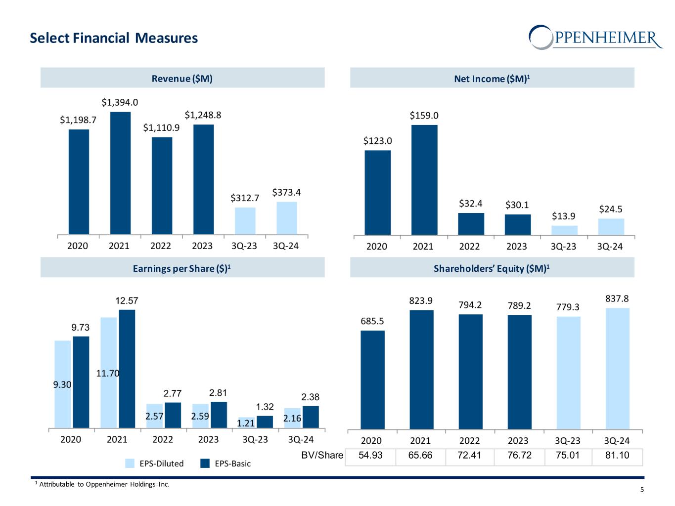 Earnings (loss) per share (Basic)1 $ 2.38 $ 1.32 80.3% Earnings (loss) per share (Diluted)1 $ 2.16 $ 1.21 78.5% Summary Operating Results: 3Q-24 vs. 3Q-23 (Unaudited) 4 Highlights ($000’s) For the 3-Months Ended REVENUE 9/30/2024 9/30/2023 % Change Commissions 103,079 83,933 22.8 % Advisory fees 121,631 107,969 12.7 % Investment banking 52,185 37,411 39.5 % Bank deposit sweep income 34,875 42,304 -17.6 % Interest 38,034 26,430 43.9 % Principal transactions, net 14,364 16,892 -15.0 % Other 9,184 (2,272) * Total Revenue 373,352 312,667 19.4 % EXPENSES Compensation and related expenses 237,935 195,684 21.6 % Non-compensation related expenses 100,047 95,396 4.9 % Total Expenses 337,982 291,080 16.1 % Pre-tax income 35,370 21,587 63.8 % Net income attributable to Oppenheimer Holdings Inc. $ 24,508 $ 13,861 76.8 % Increased revenue for the third quarter of 2024 was primarily driven by significantly higher advisory fees attributable to a rise in bil lable assets under management (“AUM”), an increase in transaction-based commissions as well as improved investment banking and interest revenues Assets under administration and under management were both at record levels at September 30, 2024, benefiting from market appreciation Compensation expenses increased from the prior year quarter largely as a result of higher incentive compensation, deferred compensation and production-related expenses Non-compensation expenses increased from the prior year quarter primarily due to higher interest and technology related expenses partially offset by lower legal costs Total stockholders' equity, book value and tangible book value per share reached new record highs as a result of positive earnings Announced plans to further strengthen balance sheet through the redemption of all outstanding Senior Secured Notes which occurred on October 10, 2024 *Percentage not meaningful. 1 Attributable to Oppenheimer Holdings Inc.