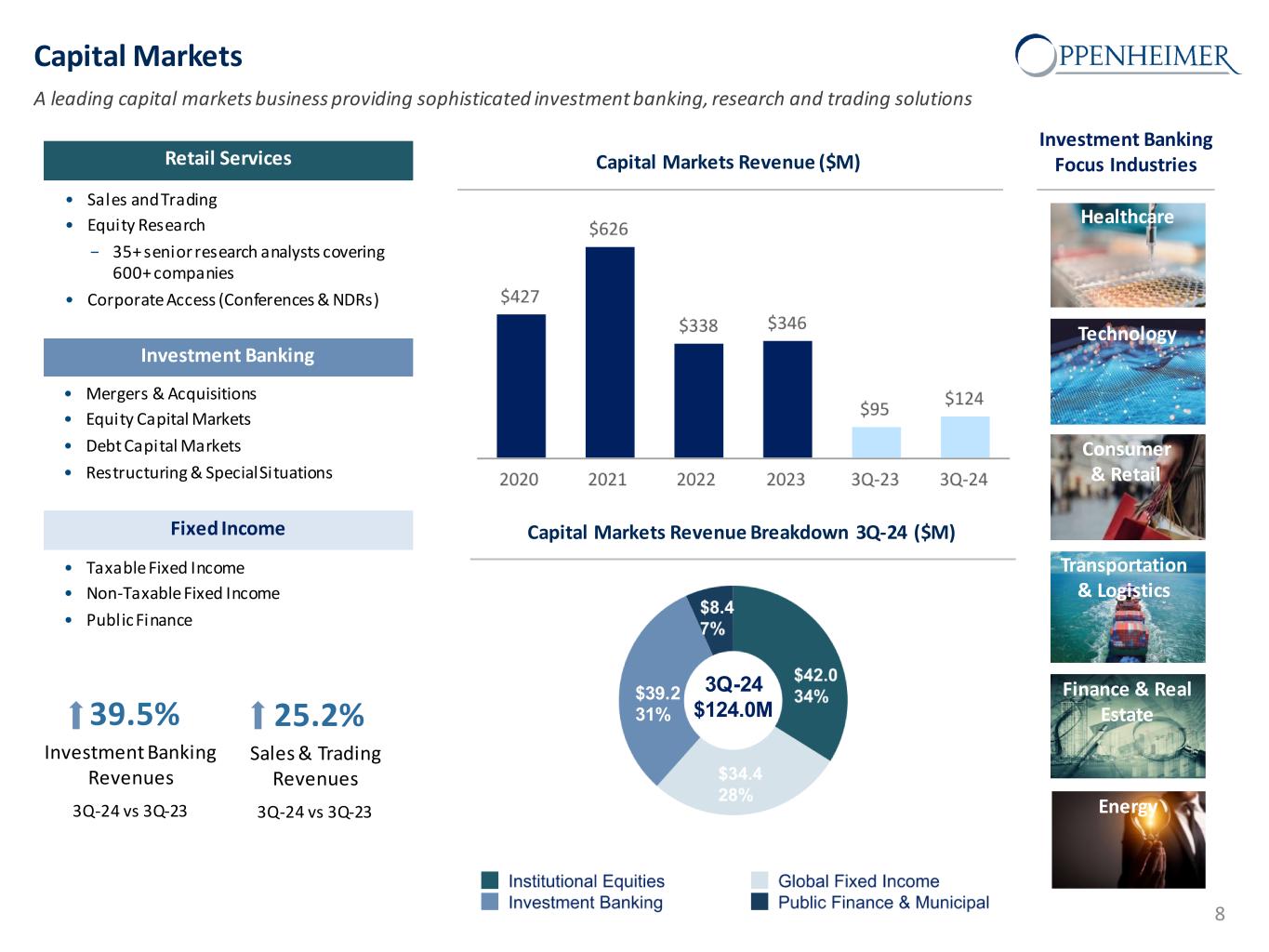 Wealth Management Well-recognized brand and one of the few independent, non-bank broker-dealers with full service capabilities Retail Services • Full-Service Brokerage • Financial Planning, Retirement Services, Insurance Solutions, Corporate & Executive Services & Trust Services • Margin & Securities Lending Advisory Services • Investment Policy Design & Implementation • Asset Allocation & Portfolio Construction • Research, Diligence & Manager Selection • Portfolio Monitoring & Reporting Retail Investments • Hedge Funds & Fund-of-Funds • Private Equity • Private Market Opportunity (Qualified Investors only) to source investments across the private markets continuum Wealth Management Revenue ($M) Pre-Tax Income ($M) and Pre-Tax Margin (%) 928 Financial Advisors At 9/30/2024 $129.8B Assets under Administration At 9/30/2024 $49.1B Assets under Management At 9/30/2024 12.7% Advisory Fees 3Q-24 vs 3Q-23 * Wealth Management includes both Private Client and Asset Management business segments. 7 25% 18% 25% 23%