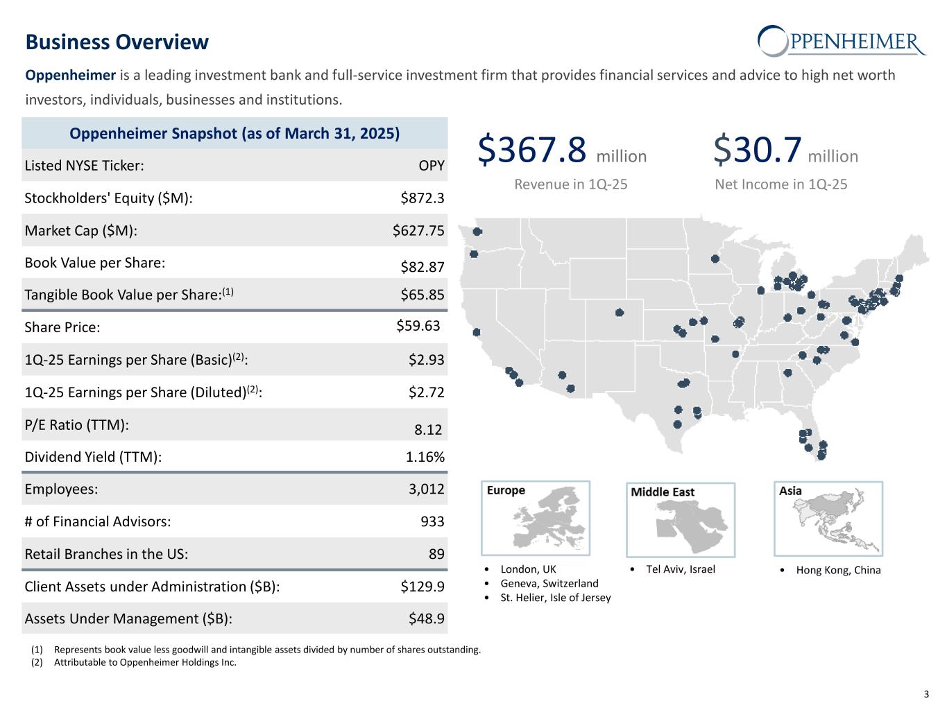 Safe Harbor Statement This presentation and other written or oral statements made from time to time by representatives of Oppenheimer Holdings Inc. ("Oppenheimer” or the “company”) may contain “forward-looking statements” within the meaning of Section 27A of the Securities Act of 1933, as amended, and Section 21E of the Securities Exchange Act of 1934, as amended. These forward-looking statements may relate to such matters as anticipated financial performance, future revenues or earnings, business prospects, new products or services, anticipated market performance and similar matters. The Private Securities Litigation Reform Act of 1995 provides a safe harbor for forward-looking statements. Forward-looking statements are neither historical facts nor assurances of future performance. Instead, they are based only on the company’s current beliefs, expectations and assumptions regarding the future of the company’s business, future plans and strategies, projections, anticipated events and trends, the economy and other future conditions. Because forward-looking statements relate to the future, they are subject to inherent uncertainties, risks and changes in circumstances that are difficult to predict and many of which are outside of the company’s control. The company cautions that a variety of factors could cause the company’s actual results to differ materially from the anticipated results or other expectations expressed in the company’s forward-looking statements. These risks and uncertainties include, but are not limited to, those risk factors discussed in Part I, “Item 1A. Risk Factors” of our Annual Report on Form 10-K for the year ended December 31, 2024 filed with the Securities and Exchange Commission (the “SEC”) on February 27, 2025 (the “2024 10-K”) and Quarterly Report on Form 10-Q for the quarter-ended March 31, 2025 filed with the SEC on April 25, 2025 (the “2025 10-Q1”). In addition, important factors that could cause actual results to differ materially from those in the forward-looking statements include those factors discussed in Part I, “Item 2. Management’s Discussion & Analysis of Financial Condition and Results of Operations” of the 2025 10-Q1. Any forward-looking statements herein are qualified in their entirety by reference to all such factors discussed in the 2024 10-K, the 2025 10-Q1 and the company’s other SEC filings. There can be no assurance that the company has correctly or completely identified and assessed all of the factors affecting the company’s business. Therefore, you should not rely on any of these forward-looking statements. Any forward-looking statement made by the company in this presentation is based only on information currently available to the company and speaks only as of the date on which it is made. The company does not undertake any obligation to publicly update or revise any forward-looking statements, whether written or oral, that may be made from time to time, whether as a result of new information, future developments or otherwise. 2
