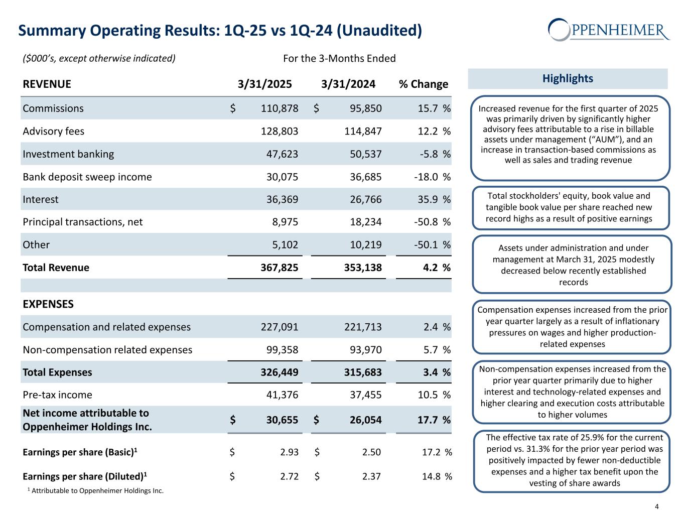 The effective tax rate of 25.9% for the current period vs. 31.3% for the prior year period was positively impacted by fewer non-deductible expenses and a higher tax benefit upon the vesting of share awards Earnings per share (Basic)1 $ 2.93 $ 2.50 17.2 % Earnings per share (Diluted)1 $ 2.72 $ 2.37 14.8 % Summary Operating Results: 1Q-25 vs 1Q-24 (Unaudited) Highlights ($000’s, except otherwise indicated) For the 3-Months Ended REVENUE 3/31/2025 3/31/2024 % Change Commissions $ 110,878 $ 95,850 15.7 % Advisory fees 128,803 114,847 12.2 % Investment banking 47,623 50,537 -5.8 % Bank deposit sweep income 30,075 36,685 -18.0 % Interest 36,369 26,766 35.9 % Principal transactions, net 8,975 18,234 -50.8 % Other 5,102 10,219 -50.1 % Total Revenue 367,825 353,138 4.2 % EXPENSES Compensation and related expenses 227,091 221,713 2.4 % Non-compensation related expenses 99,358 93,970 5.7 % Total Expenses 326,449 315,683 3.4 % Pre-tax income 41,376 37,455 10.5 % Net income attributable to Oppenheimer Holdings Inc. $ 30,655 $ 26,054 17.7 % Increased revenue for the first quarter of 2025 was primarily driven by significantly higher advisory fees attributable to a rise in billable assets under management (“AUM”), and an increase in transaction-based commissions as well as sales and trading revenue Assets under administration and under management at March 31, 2025 modestly decreased below recently established records Compensation expenses increased from the prior year quarter largely as a result of inflationary pressures on wages and higher production- related expenses Non-compensation expenses increased from the prior year quarter primarily due to higher interest and technology-related expenses and higher clearing and execution costs attributable to higher volumes Total stockholders' equity, book value and tangible book value per share reached new record highs as a result of positive earnings 1 Attributable to Oppenheimer Holdings Inc. 4