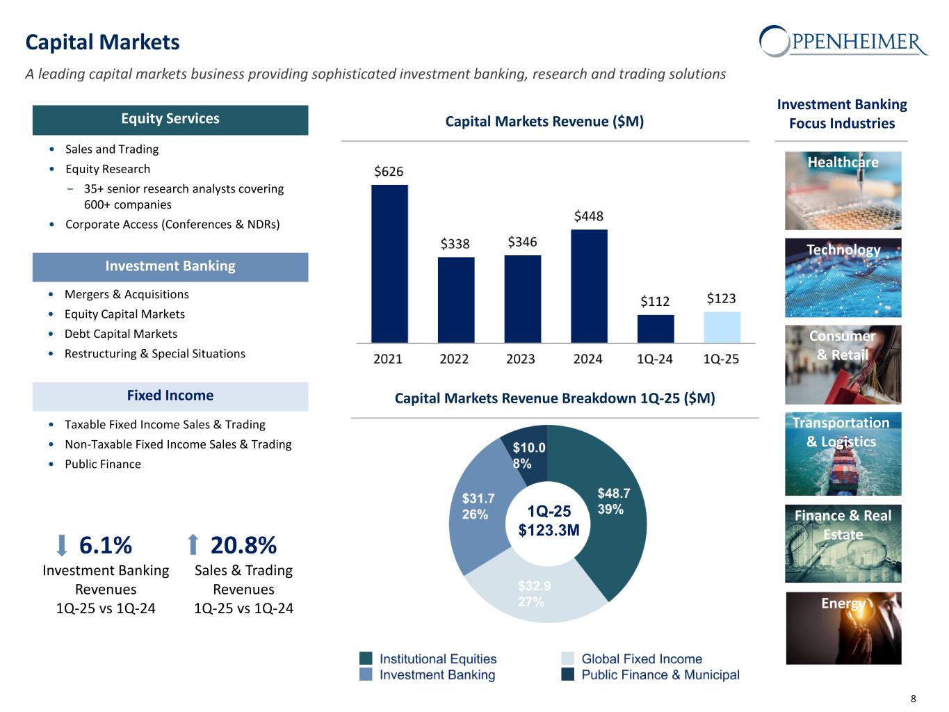 20.8% Sales & Trading Revenues 1Q-25 vs 1Q-24 6.1% Investment Banking Revenues 1Q-25 vs 1Q-24 Capital Markets A leading capital markets business providing sophisticated investment banking, research and trading solutions Healthcare Technology Transportation & Logistics Finance & Real Estate Consumer & Retail Energy Capital Markets Revenue Breakdown 1Q-25 ($M) Capital Markets Revenue ($M) Investment Banking Focus Industries Institutional Equities • Sales and Trading • Equity Research − 35+ senior research analysts covering 600+ companies • Corporate Access (Conferences & NDRs) Investment Banking • Mergers & Acquisitions • Equity Capital Markets • Debt Capital Markets • Restructuring & Special Situations Fixed Income • Taxable Fixed Income Sales & Trading • Non-Taxable Fixed Income Sales & Trading • Public Finance Eq ity Services 1Q-25 $123.3M 8