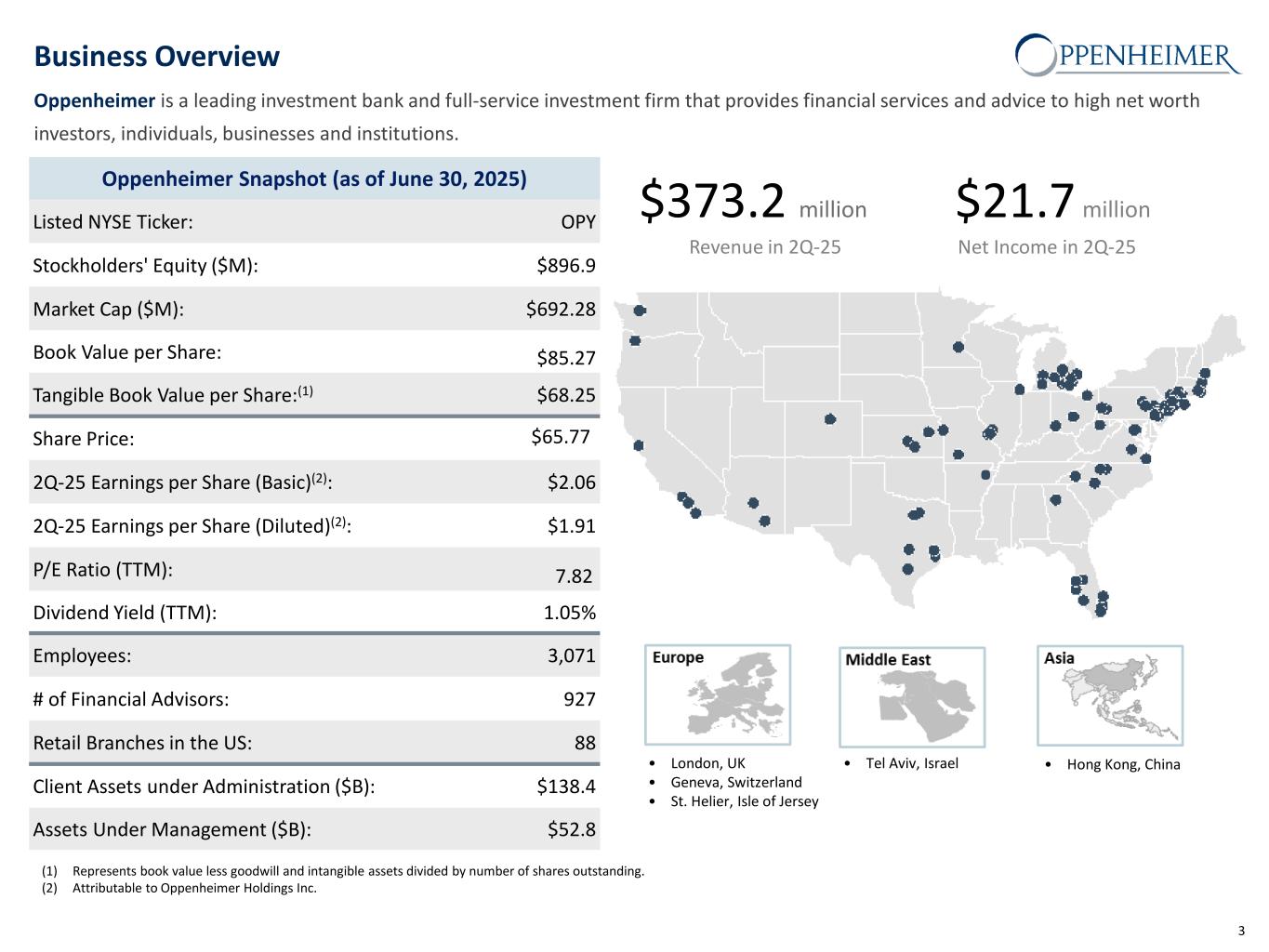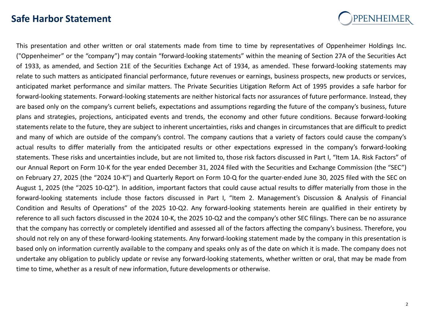 Safe Harbor Statement This presentation and other written or oral statements made from time to time by representatives of Oppenheimer Holdings Inc. ("Oppenheimer” or the “company”) may contain “forward-looking statements” within the meaning of Section 27A of the Securities Act of 1933, as amended, and Section 21E of the Securities Exchange Act of 1934, as amended. These forward-looking statements may relate to such matters as anticipated financial performance, future revenues or earnings, business prospects, new products or services, anticipated market performance and similar matters. The Private Securities Litigation Reform Act of 1995 provides a safe harbor for forward-looking statements. Forward-looking statements are neither historical facts nor assurances of future performance. Instead, they are based only on the company’s current beliefs, expectations and assumptions regarding the future of the company’s business, future plans and strategies, projections, anticipated events and trends, the economy and other future conditions. Because forward-looking statements relate to the future, they are subject to inherent uncertainties, risks and changes in circumstances that are difficult to predict and many of which are outside of the company’s control. The company cautions that a variety of factors could cause the company’s actual results to differ materially from the anticipated results or other expectations expressed in the company’s forward-looking statements. These risks and uncertainties include, but are not limited to, those risk factors discussed in Part I, “Item 1A. Risk Factors” of our Annual Report on Form 10-K for the year ended December 31, 2024 filed with the Securities and Exchange Commission (the “SEC”) on February 27, 2025 (the “2024 10-K”) and Quarterly Report on Form 10-Q for the quarter-ended June 30, 2025 filed with the SEC on August 1, 2025 (the “2025 10-Q2”). In addition, important factors that could cause actual results to differ materially from those in the forward-looking statements include those factors discussed in Part I, “Item 2. Management’s Discussion & Analysis of Financial Condition and Results of Operations” of the 2025 10-Q2. Any forward-looking statements herein are qualified in their entirety by reference to all such factors discussed in the 2024 10-K, the 2025 10-Q2 and the company’s other SEC filings. There can be no assurance that the company has correctly or completely identified and assessed all of the factors affecting the company’s business. Therefore, you should not rely on any of these forward-looking statements. Any forward-looking statement made by the company in this presentation is based only on information currently available to the company and speaks only as of the date on which it is made. The company does not undertake any obligation to publicly update or revise any forward-looking statements, whether written or oral, that may be made from time to time, whether as a result of new information, future developments or otherwise. 2