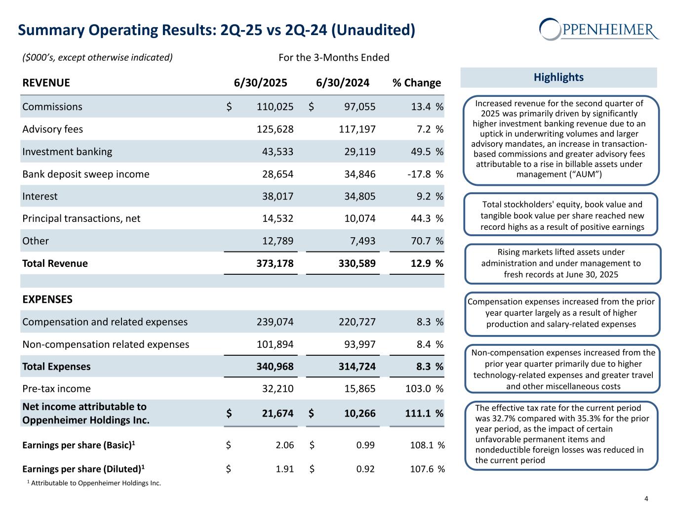 The effective tax rate for the current period was 32.7% compared with 35.3% for the prior year period, as the impact of certain unfavorable permanent items and nondeductible foreign losses was reduced in the current period Earnings per share (Basic)1 $ 2.06 $ 0.99 108.1 % Earnings per share (Diluted)1 $ 1.91 $ 0.92 107.6 % Summary Operating Results: 2Q-25 vs 2Q-24 (Unaudited) Highlights ($000’s, except otherwise indicated) For the 3-Months Ended REVENUE 6/30/2025 6/30/2024 % Change Commissions $ 110,025 $ 97,055 13.4 % Advisory fees 125,628 117,197 7.2 % Investment banking 43,533 29,119 49.5 % Bank deposit sweep income 28,654 34,846 -17.8 % Interest 38,017 34,805 9.2 % Principal transactions, net 14,532 10,074 44.3 % Other 12,789 7,493 70.7 % Total Revenue 373,178 330,589 12.9 % EXPENSES Compensation and related expenses 239,074 220,727 8.3 % Non-compensation related expenses 101,894 93,997 8.4 % Total Expenses 340,968 314,724 8.3 % Pre-tax income 32,210 15,865 103.0 % Net income attributable to Oppenheimer Holdings Inc. $ 21,674 $ 10,266 111.1 % Increased revenue for the second quarter of 2025 was primarily driven by significantly higher investment banking revenue due to an uptick in underwriting volumes and larger advisory mandates, an increase in transaction- based commissions and greater advisory fees attributable to a rise in billable assets under management (“AUM”) Rising markets lifted assets under administration and under management to fresh records at June 30, 2025 Compensation expenses increased from the prior year quarter largely as a result of higher production and salary-related expenses Non-compensation expenses increased from the prior year quarter primarily due to higher technology-related expenses and greater travel and other miscellaneous costs Total stockholders' equity, book value and tangible book value per share reached new record highs as a result of positive earnings 1 Attributable to Oppenheimer Holdings Inc. 4
