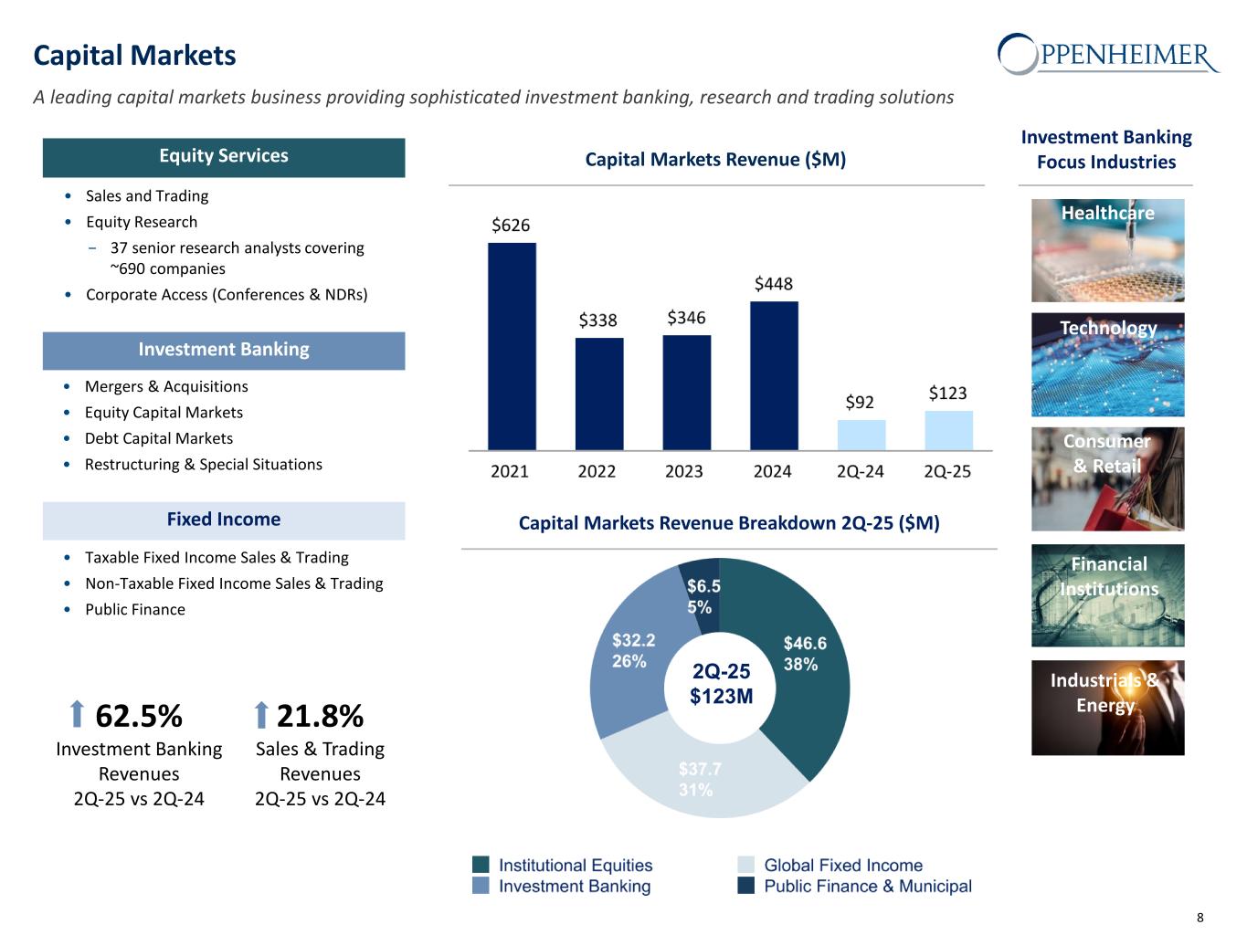 21.8% Sales & Trading Revenues 2Q-25 vs 2Q-24 62.5% Investment Banking Revenues 2Q-25 vs 2Q-24 Capital Markets A leading capital markets business providing sophisticated investment banking, research and trading solutions Healthcare Technology Transportation & Logistics Financial Institutions Consumer & Retail Industrials & Energy Capital Markets Revenue Breakdown 2Q-25 ($M) Capital Markets Revenue ($M) Investment Banking Focus IndustriesInstitutional Equities • Sales and Trading • Equity Research − 37 senior research analysts covering ~690 companies • Corporate Access (Conferences & NDRs) Investment Banking • Mergers & Acquisitions • Equity Capital Markets • Debt Capital Markets • Restructuring & Special Situations Fixed Income • Taxable Fixed Income Sales & Trading • Non-Taxable Fixed Income Sales & Trading • Public Finance Eq ity Services 2Q-25 $123M 8