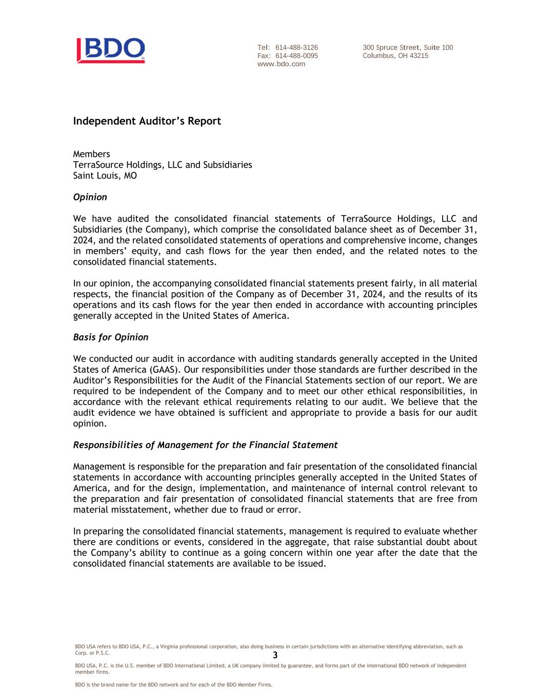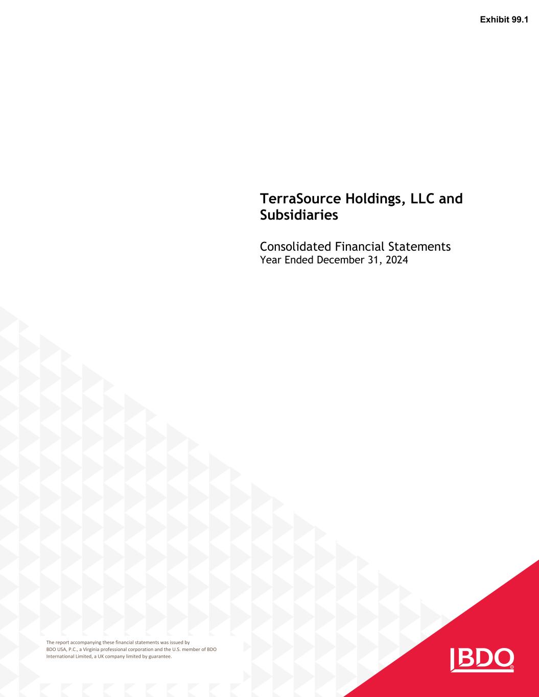 BDO USA refers to BDO USA, P.C., a Virginia professional corporation, also doing business in certain jurisdictions with an alternative identifying abbreviation, such as Corp. or P.S.C. BDO USA, P.C. is the U.S. member of BDO International Limited, a UK company limited by guarantee, and forms part of the international BDO network of independent member firms. BDO is the brand name for the BDO network and for each of the BDO Member Firms. 300 Spruce Street, Suite 100 Columbus, OH 43215 Tel: 614-488-3126 Fax: 614-488-0095 www.bdo.com 3 Independent Auditor’s Report Members TerraSource Holdings, LLC and Subsidiaries Saint Louis, MO Opinion We have audited the consolidated financial statements of TerraSource Holdings, LLC and Subsidiaries (the Company), which comprise the consolidated balance sheet as of December 31, 2024, and the related consolidated statements of operations and comprehensive income, changes in members’ equity, and cash flows for the year then ended, and the related notes to the consolidated financial statements. In our opinion, the accompanying consolidated financial statements present fairly, in all material respects, the financial position of the Company as of December 31, 2024, and the results of its operations and its cash flows for the year then ended in accordance with accounting principles generally accepted in the United States of America. Basis for Opinion We conducted our audit in accordance with auditing standards generally accepted in the United States of America (GAAS). Our responsibilities under those standards are further described in the Auditor’s Responsibilities for the Audit of the Financial Statements section of our report. We are required to be independent of the Company and to meet our other ethical responsibilities, in accordance with the relevant ethical requirements relating to our audit. We believe that the audit evidence we have obtained is sufficient and appropriate to provide a basis for our audit opinion. Responsibilities of Management for the Financial Statement Management is responsible for the preparation and fair presentation of the consolidated financial statements in accordance with accounting principles generally accepted in the United States of America, and for the design, implementation, and maintenance of internal control relevant to the preparation and fair presentation of consolidated financial statements that are free from material misstatement, whether due to fraud or error. In preparing the consolidated financial statements, management is required to evaluate whether there are conditions or events, considered in the aggregate, that raise substantial doubt about the Company’s ability to continue as a going concern within one year after the date that the consolidated financial statements are available to be issued.