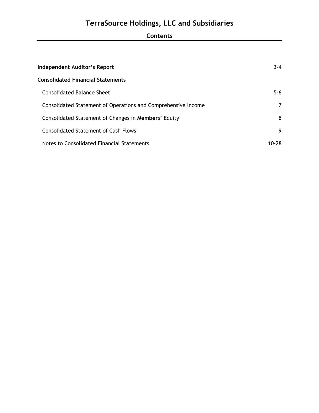 TerraSource Holdings, LLC and Subsidiaries Contents Independent Auditor’s Report 3-4 Consolidated Financial Statements Consolidated Balance Sheet 5-6 Consolidated Statement of Operations and Comprehensive Income 7 Consolidated Statement of Changes in Members’ Equity 8 Consolidated Statement of Cash Flows 9 Notes to Consolidated Financial Statements 10-28
