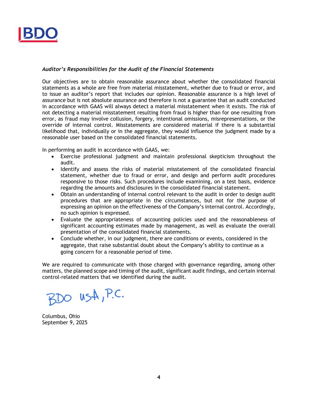 4 Auditor’s Responsibilities for the Audit of the Financial Statements Our objectives are to obtain reasonable assurance about whether the consolidated financial statements as a whole are free from material misstatement, whether due to fraud or error, and to issue an auditor’s report that includes our opinion. Reasonable assurance is a high level of assurance but is not absolute assurance and therefore is not a guarantee that an audit conducted in accordance with GAAS will always detect a material misstatement when it exists. The risk of not detecting a material misstatement resulting from fraud is higher than for one resulting from error, as fraud may involve collusion, forgery, intentional omissions, misrepresentations, or the override of internal control. Misstatements are considered material if there is a substantial likelihood that, individually or in the aggregate, they would influence the judgment made by a reasonable user based on the consolidated financial statements. In performing an audit in accordance with GAAS, we: • Exercise professional judgment and maintain professional skepticism throughout the audit. • Identify and assess the risks of material misstatement of the consolidated financial statement, whether due to fraud or error, and design and perform audit procedures responsive to those risks. Such procedures include examining, on a test basis, evidence regarding the amounts and disclosures in the consolidated financial statement. • Obtain an understanding of internal control relevant to the audit in order to design audit procedures that are appropriate in the circumstances, but not for the purpose of expressing an opinion on the effectiveness of the Company’s internal control. Accordingly, no such opinion is expressed. • Evaluate the appropriateness of accounting policies used and the reasonableness of significant accounting estimates made by management, as well as evaluate the overall presentation of the consolidated financial statements. • Conclude whether, in our judgment, there are conditions or events, considered in the aggregate, that raise substantial doubt about the Company’s ability to continue as a going concern for a reasonable period of time. We are required to communicate with those charged with governance regarding, among other matters, the planned scope and timing of the audit, significant audit findings, and certain internal control-related matters that we identified during the audit. Columbus, Ohio September 9, 2025