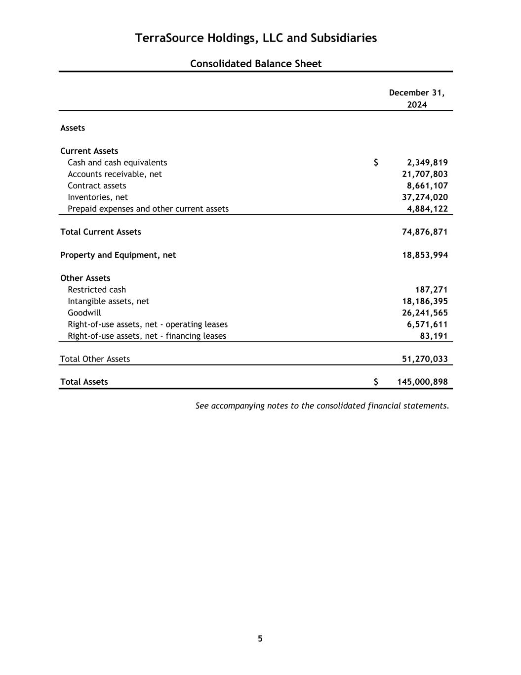December 31, 2024 Assets Current Assets Cash and cash equivalents $ 2,349,819 Accounts receivable, net 21,707,803 Contract assets 8,661,107 Inventories, net 37,274,020 Prepaid expenses and other current assets 4,884,122 Total Current Assets 74,876,871 Property and Equipment, net 18,853,994 Other Assets Restricted cash 187,271 Intangible assets, net 18,186,395 Goodwill 26,241,565 Right-of-use assets, net - operating leases 6,571,611 Right-of-use assets, net - financing leases 83,191 Total Other Assets 51,270,033 Total Assets $ 145,000,898 TerraSource Holdings, LLC and Subsidiaries Consolidated Balance Sheet See accompanying notes to the consolidated financial statements. 5