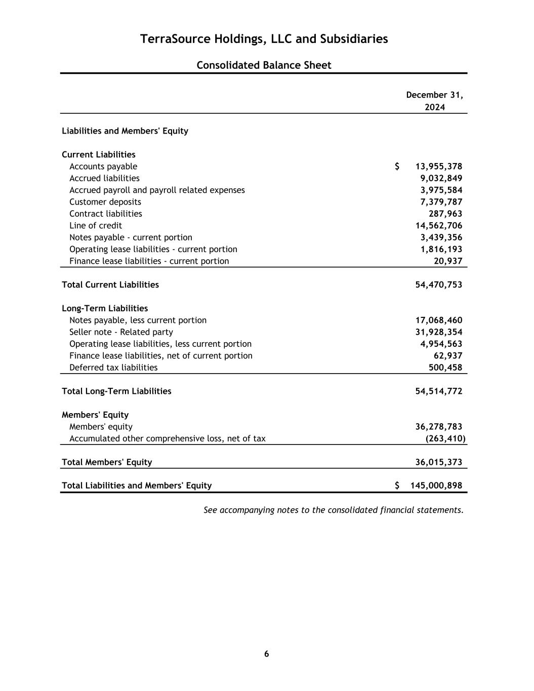 December 31, 2024 Liabilities and Members' Equity Current Liabilities Accounts payable $ 13,955,378 Accrued liabilities 9,032,849 Accrued payroll and payroll related expenses 3,975,584 Customer deposits 7,379,787 Contract liabilities 287,963 Line of credit 14,562,706 Notes payable - current portion 3,439,356 Operating lease liabilities - current portion 1,816,193 Finance lease liabilities - current portion 20,937 Total Current Liabilities 54,470,753 Long-Term Liabilities Notes payable, less current portion 17,068,460 Seller note - Related party 31,928,354 Operating lease liabilities, less current portion 4,954,563 Finance lease liabilities, net of current portion 62,937 Deferred tax liabilities 500,458 Total Long-Term Liabilities 54,514,772 Members' Equity Members' equity 36,278,783 Accumulated other comprehensive loss, net of tax (263,410) Total Members' Equity 36,015,373 Total Liabilities and Members' Equity $ 145,000,898 TerraSource Holdings, LLC and Subsidiaries Consolidated Balance Sheet See accompanying notes to the consolidated financial statements. 6