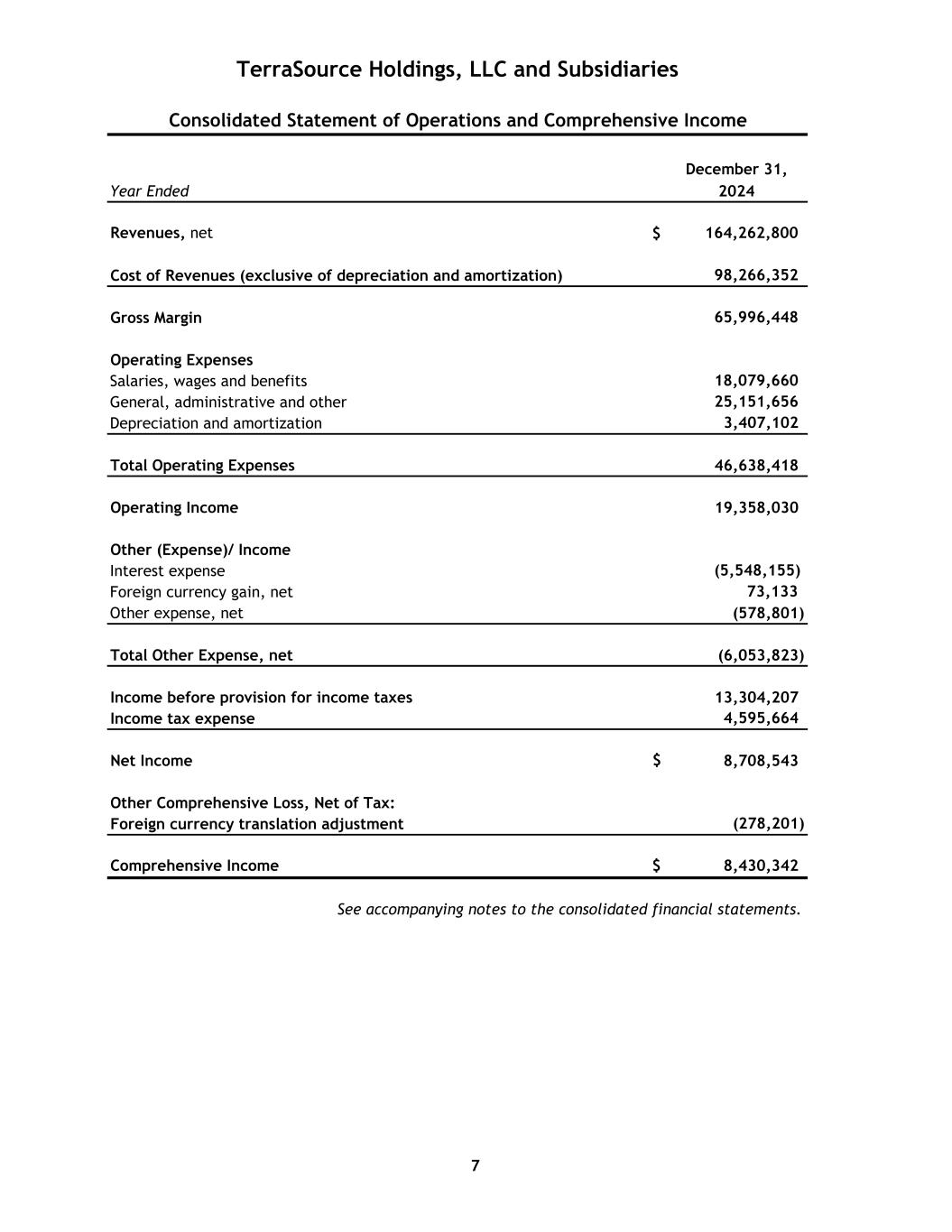December 31, Year Ended 2024 Revenues, net $ 164,262,800 Cost of Revenues (exclusive of depreciation and amortization) 98,266,352 Gross Margin 65,996,448 Operating Expenses Salaries, wages and benefits 18,079,660 General, administrative and other 25,151,656 Depreciation and amortization 3,407,102 Total Operating Expenses 46,638,418 Operating Income 19,358,030 Other (Expense)/ Income Interest expense (5,548,155) Foreign currency gain, net 73,133 Other expense, net (578,801) Total Other Expense, net (6,053,823) Income before provision for income taxes 13,304,207 Income tax expense 4,595,664 Net Income $ 8,708,543 Other Comprehensive Loss, Net of Tax: Foreign currency translation adjustment (278,201) Comprehensive Income $ 8,430,342 See accompanying notes to the consolidated financial statements. TerraSource Holdings, LLC and Subsidiaries Consolidated Statement of Operations and Comprehensive Income 7