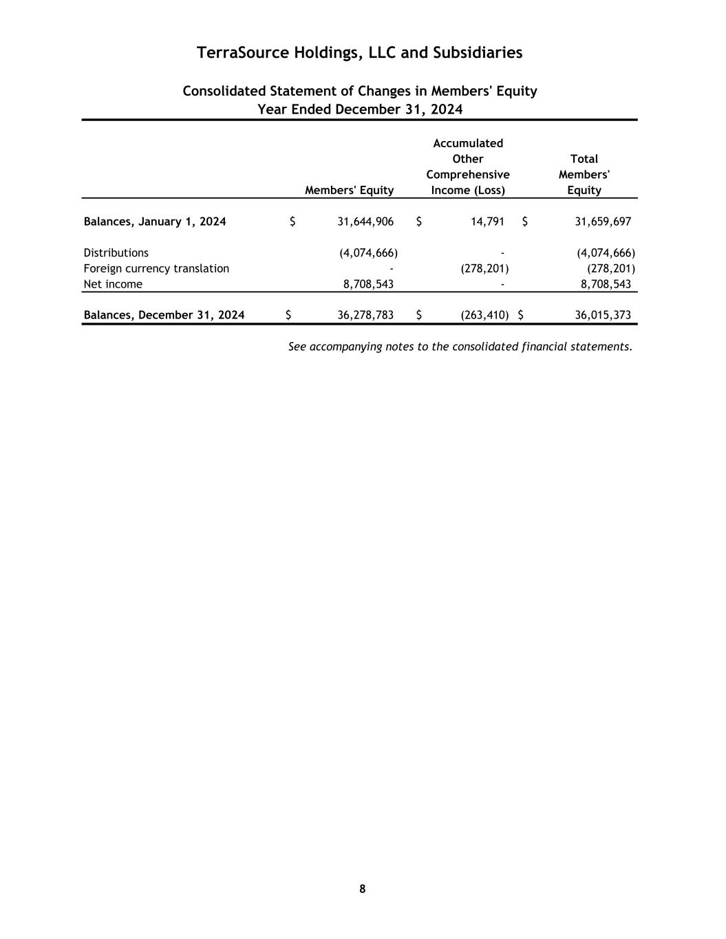 Accumulated Other Total Comprehensive Members' Members' Equity Income (Loss) Equity Balances, January 1, 2024 $ 31,644,906 $ 14,791 $ 31,659,697 Distributions (4,074,666) - (4,074,666) Foreign currency translation - (278,201) (278,201) Net income 8,708,543 - 8,708,543 Balances, December 31, 2024 $ 36,278,783 $ (263,410) $ 36,015,373 TerraSource Holdings, LLC and Subsidiaries Consolidated Statement of Changes in Members' Equity Year Ended December 31, 2024 See accompanying notes to the consolidated financial statements. 8
