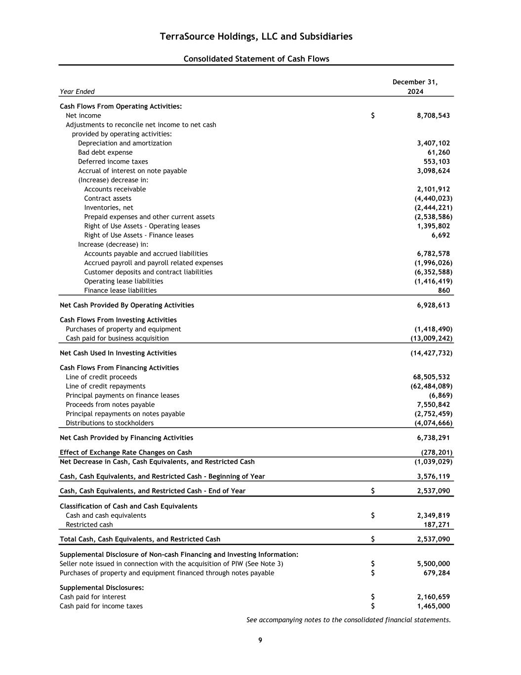 December 31, Year Ended 2024 Cash Flows From Operating Activities: Net income $ 8,708,543 Adjustments to reconcile net income to net cash provided by operating activities: Depreciation and amortization 3,407,102 Bad debt expense 61,260 Deferred income taxes 553,103 Accrual of interest on note payable 3,098,624 (Increase) decrease in: Accounts receivable 2,101,912 Contract assets (4,440,023) Inventories, net (2,444,221) Prepaid expenses and other current assets (2,538,586) Right of Use Assets - Operating leases 1,395,802 Right of Use Assets - Finance leases 6,692 Increase (decrease) in: Accounts payable and accrued liabilities 6,782,578 Accrued payroll and payroll related expenses (1,996,026) Customer deposits and contract liabilities (6,352,588) Operating lease liabilities (1,416,419) Finance lease liabilities 860 Net Cash Provided By Operating Activities 6,928,613 Cash Flows From Investing Activities Purchases of property and equipment (1,418,490) Cash paid for business acquisition (13,009,242) Net Cash Used In Investing Activities (14,427,732) Cash Flows From Financing Activities Line of credit proceeds 68,505,532 Line of credit repayments (62,484,089) Principal payments on finance leases (6,869) Proceeds from notes payable 7,550,842 Principal repayments on notes payable (2,752,459) Distributions to stockholders (4,074,666) Net Cash Provided by Financing Activities 6,738,291 Effect of Exchange Rate Changes on Cash (278,201) Net Decrease in Cash, Cash Equivalents, and Restricted Cash (1,039,029) Cash, Cash Equivalents, and Restricted Cash - Beginning of Year 3,576,119 Cash, Cash Equivalents, and Restricted Cash - End of Year $ 2,537,090 Classification of Cash and Cash Equivalents Cash and cash equivalents $ 2,349,819 Restricted cash 187,271 Total Cash, Cash Equivalents, and Restricted Cash $ 2,537,090 Supplemental Disclosure of Non-cash Financing and Investing Information: Seller note issued in connection with the acquisition of PIW (See Note 3) $ 5,500,000 Purchases of property and equipment financed through notes payable $ 679,284 Supplemental Disclosures: Cash paid for interest $ 2,160,659 Cash paid for income taxes $ 1,465,000 See accompanying notes to the consolidated financial statements. TerraSource Holdings, LLC and Subsidiaries Consolidated Statement of Cash Flows 9