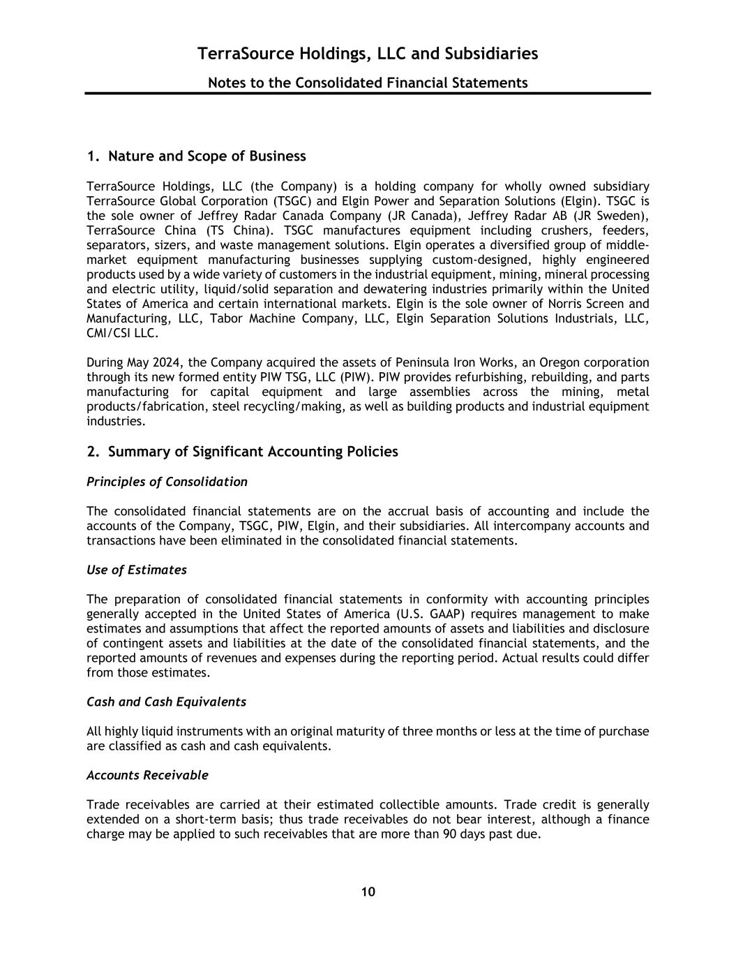 TerraSource Holdings, LLC and Subsidiaries Notes to the Consolidated Financial Statements 10 1. Nature and Scope of Business TerraSource Holdings, LLC (the Company) is a holding company for wholly owned subsidiary TerraSource Global Corporation (TSGC) and Elgin Power and Separation Solutions (Elgin). TSGC is the sole owner of Jeffrey Radar Canada Company (JR Canada), Jeffrey Radar AB (JR Sweden), TerraSource China (TS China). TSGC manufactures equipment including crushers, feeders, separators, sizers, and waste management solutions. Elgin operates a diversified group of middle- market equipment manufacturing businesses supplying custom-designed, highly engineered products used by a wide variety of customers in the industrial equipment, mining, mineral processing and electric utility, liquid/solid separation and dewatering industries primarily within the United States of America and certain international markets. Elgin is the sole owner of Norris Screen and Manufacturing, LLC, Tabor Machine Company, LLC, Elgin Separation Solutions Industrials, LLC, CMI/CSI LLC. During May 2024, the Company acquired the assets of Peninsula Iron Works, an Oregon corporation through its new formed entity PIW TSG, LLC (PIW). PIW provides refurbishing, rebuilding, and parts manufacturing for capital equipment and large assemblies across the mining, metal products/fabrication, steel recycling/making, as well as building products and industrial equipment industries. 2. Summary of Significant Accounting Policies Principles of Consolidation The consolidated financial statements are on the accrual basis of accounting and include the accounts of the Company, TSGC, PIW, Elgin, and their subsidiaries. All intercompany accounts and transactions have been eliminated in the consolidated financial statements. Use of Estimates The preparation of consolidated financial statements in conformity with accounting principles generally accepted in the United States of America (U.S. GAAP) requires management to make estimates and assumptions that affect the reported amounts of assets and liabilities and disclosure of contingent assets and liabilities at the date of the consolidated financial statements, and the reported amounts of revenues and expenses during the reporting period. Actual results could differ from those estimates. Cash and Cash Equivalents All highly liquid instruments with an original maturity of three months or less at the time of purchase are classified as cash and cash equivalents. Accounts Receivable Trade receivables are carried at their estimated collectible amounts. Trade credit is generally extended on a short-term basis; thus trade receivables do not bear interest, although a finance charge may be applied to such receivables that are more than 90 days past due.