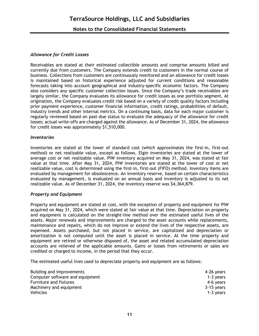 TerraSource Holdings, LLC and Subsidiaries Notes to the Consolidated Financial Statements 11 Allowance for Credit Losses Receivables are stated at their estimated collectible amounts and comprise amounts billed and currently due from customers. The Company extends credit to customers in the normal course of business. Collections from customers are continuously monitored and an allowance for credit losses is maintained based on historical experience adjusted for current conditions and reasonable forecasts taking into account geographical and industry-specific economic factors. The Company also considers any specific customer collection issues. Since the Company’s trade receivables are largely similar, the Company evaluates its allowance for credit losses as one portfolio segment. At origination, the Company evaluates credit risk based on a variety of credit quality factors including prior payment experience, customer financial information, credit ratings, probabilities of default, industry trends and other internal metrics. On a continuing basis, data for each major customer is regularly reviewed based on past-due status to evaluate the adequacy of the allowance for credit losses; actual write-offs are charged against the allowance. As of December 31, 2024, the allowance for credit losses was approximately $1,510,000. Inventories Inventories are stated at the lower of standard cost (which approximates the first-in, first-out method) or net realizable value, except as follows. Elgin inventories are stated at the lower of average cost or net realizable value. PIW inventory acquired on May 31, 2024, was stated at fair value at that time. After May 31, 2024, PIW inventories are stated at the lower of cost or net realizable value, cost is determined using the first-in, first-out (FIFO) method. Inventory items are evaluated by management for obsolescence. An inventory reserve, based on certain characteristics evaluated by management, is evaluated on an annual basis and inventory is adjusted to its net realizable value. As of December 31, 2024, the inventory reserve was $4,364,879. Property and Equipment Property and equipment are stated at cost, with the exception of property and equipment for PIW acquired on May 31, 2024, which were stated at fair value at that time. Depreciation on property and equipment is calculated on the straight-line method over the estimated useful lives of the assets. Major renewals and improvements are charged to the asset accounts while replacements, maintenance and repairs, which do not improve or extend the lives of the respective assets, are expensed. Assets purchased, but not placed in service, are capitalized and depreciation or amortization is not computed until the asset is placed in service. At the time property and equipment are retired or otherwise disposed of, the asset and related accumulated depreciation accounts are relieved of the applicable amounts. Gains or losses from retirements or sales are credited or charged to income, in the period that they occur. The estimated useful lives used to depreciate property and equipment are as follows: Building and improvements 4-26 years Computer software and equipment 1-3 years Furniture and fixtures 4-6 years Machinery and equipment 3-15 years Vehicles 1-3 years