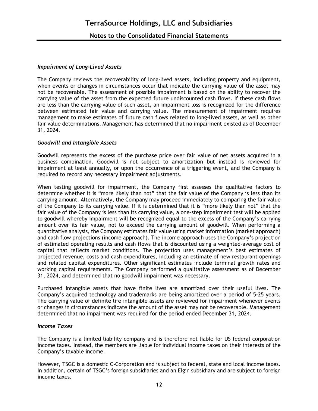 TerraSource Holdings, LLC and Subsidiaries Notes to the Consolidated Financial Statements 12 Impairment of Long-Lived Assets The Company reviews the recoverability of long-lived assets, including property and equipment, when events or changes in circumstances occur that indicate the carrying value of the asset may not be recoverable. The assessment of possible impairment is based on the ability to recover the carrying value of the asset from the expected future undiscounted cash flows. If these cash flows are less than the carrying value of such asset, an impairment loss is recognized for the difference between estimated fair value and carrying value. The measurement of impairment requires management to make estimates of future cash flows related to long-lived assets, as well as other fair value determinations. Management has determined that no impairment existed as of December 31, 2024. Goodwill and Intangible Assets Goodwill represents the excess of the purchase price over fair value of net assets acquired in a business combination. Goodwill is not subject to amortization but instead is reviewed for impairment at least annually, or upon the occurrence of a triggering event, and the Company is required to record any necessary impairment adjustments. When testing goodwill for impairment, the Company first assesses the qualitative factors to determine whether it is “more likely than not” that the fair value of the Company is less than its carrying amount. Alternatively, the Company may proceed immediately to comparing the fair value of the Company to its carrying value. If it is determined that it is “more likely than not” that the fair value of the Company is less than its carrying value, a one-step impairment test will be applied to goodwill whereby impairment will be recognized equal to the excess of the Company’s carrying amount over its fair value, not to exceed the carrying amount of goodwill. When performing a quantitative analysis, the Company estimates fair value using market information (market approach) and cash flow projections (income approach). The income approach uses the Company’s projection of estimated operating results and cash flows that is discounted using a weighted-average cost of capital that reflects market conditions. The projection uses management’s best estimates of projected revenue, costs and cash expenditures, including an estimate of new restaurant openings and related capital expenditures. Other significant estimates include terminal growth rates and working capital requirements. The Company performed a qualitative assessment as of December 31, 2024, and determined that no goodwill impairment was necessary. Purchased intangible assets that have finite lives are amortized over their useful lives. The Company’s acquired technology and trademarks are being amortized over a period of 5-25 years. The carrying value of definite life intangible assets are reviewed for impairment whenever events or changes in circumstances indicate the amount of the asset may not be recoverable. Management determined that no impairment was required for the period ended December 31, 2024. Income Taxes The Company is a limited liability company and is therefore not liable for US federal corporation income taxes. Instead, the members are liable for individual income taxes on their interests of the Company’s taxable income. However, TSGC is a domestic C-Corporation and is subject to federal, state and local income taxes. In addition, certain of TSGC’s foreign subsidiaries and an Elgin subsidiary and are subject to foreign income taxes.