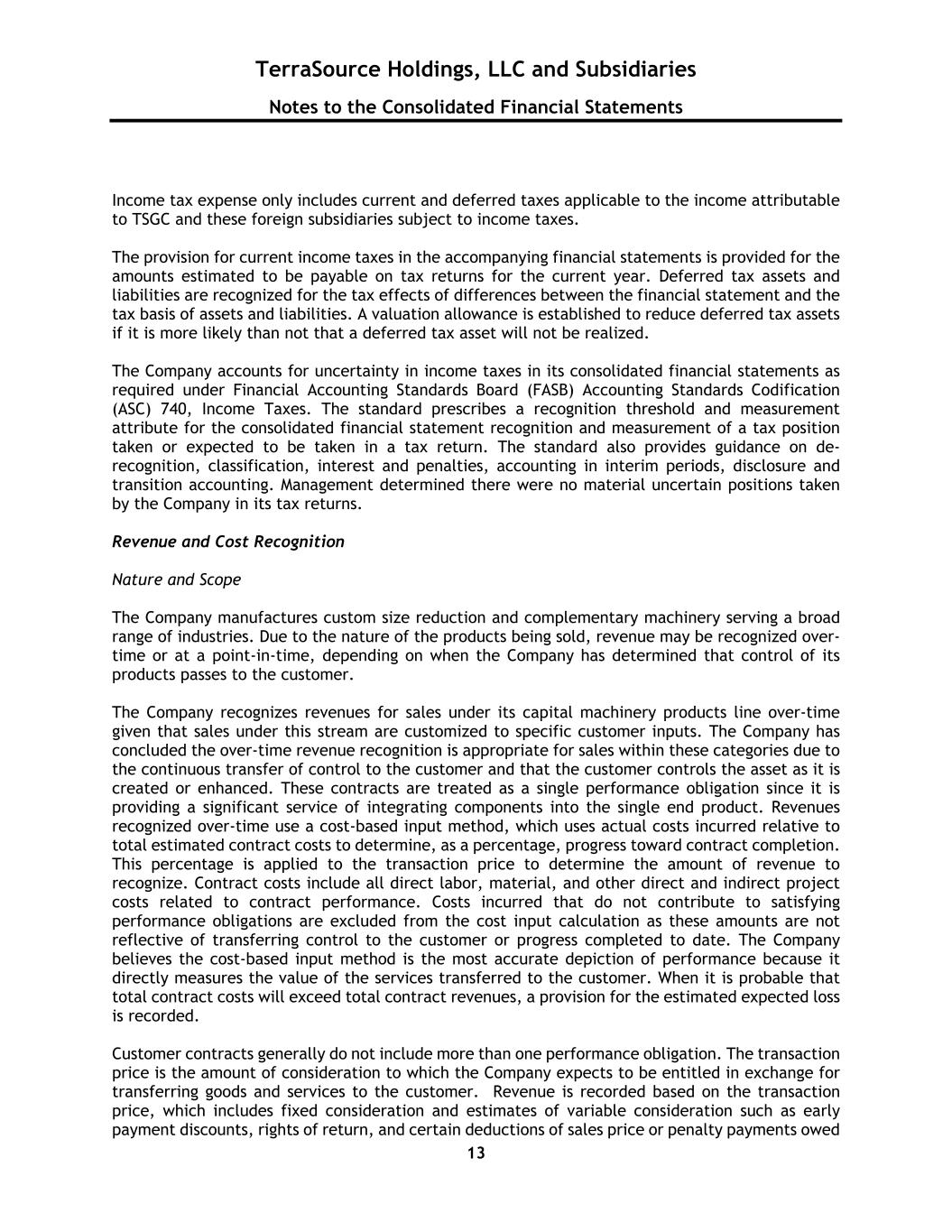TerraSource Holdings, LLC and Subsidiaries Notes to the Consolidated Financial Statements 13 Income tax expense only includes current and deferred taxes applicable to the income attributable to TSGC and these foreign subsidiaries subject to income taxes. The provision for current income taxes in the accompanying financial statements is provided for the amounts estimated to be payable on tax returns for the current year. Deferred tax assets and liabilities are recognized for the tax effects of differences between the financial statement and the tax basis of assets and liabilities. A valuation allowance is established to reduce deferred tax assets if it is more likely than not that a deferred tax asset will not be realized. The Company accounts for uncertainty in income taxes in its consolidated financial statements as required under Financial Accounting Standards Board (FASB) Accounting Standards Codification (ASC) 740, Income Taxes. The standard prescribes a recognition threshold and measurement attribute for the consolidated financial statement recognition and measurement of a tax position taken or expected to be taken in a tax return. The standard also provides guidance on de- recognition, classification, interest and penalties, accounting in interim periods, disclosure and transition accounting. Management determined there were no material uncertain positions taken by the Company in its tax returns. Revenue and Cost Recognition Nature and Scope The Company manufactures custom size reduction and complementary machinery serving a broad range of industries. Due to the nature of the products being sold, revenue may be recognized over- time or at a point-in-time, depending on when the Company has determined that control of its products passes to the customer. The Company recognizes revenues for sales under its capital machinery products line over-time given that sales under this stream are customized to specific customer inputs. The Company has concluded the over-time revenue recognition is appropriate for sales within these categories due to the continuous transfer of control to the customer and that the customer controls the asset as it is created or enhanced. These contracts are treated as a single performance obligation since it is providing a significant service of integrating components into the single end product. Revenues recognized over-time use a cost-based input method, which uses actual costs incurred relative to total estimated contract costs to determine, as a percentage, progress toward contract completion. This percentage is applied to the transaction price to determine the amount of revenue to recognize. Contract costs include all direct labor, material, and other direct and indirect project costs related to contract performance. Costs incurred that do not contribute to satisfying performance obligations are excluded from the cost input calculation as these amounts are not reflective of transferring control to the customer or progress completed to date. The Company believes the cost-based input method is the most accurate depiction of performance because it directly measures the value of the services transferred to the customer. When it is probable that total contract costs will exceed total contract revenues, a provision for the estimated expected loss is recorded. Customer contracts generally do not include more than one performance obligation. The transaction price is the amount of consideration to which the Company expects to be entitled in exchange for transferring goods and services to the customer. Revenue is recorded based on the transaction price, which includes fixed consideration and estimates of variable consideration such as early payment discounts, rights of return, and certain deductions of sales price or penalty payments owed