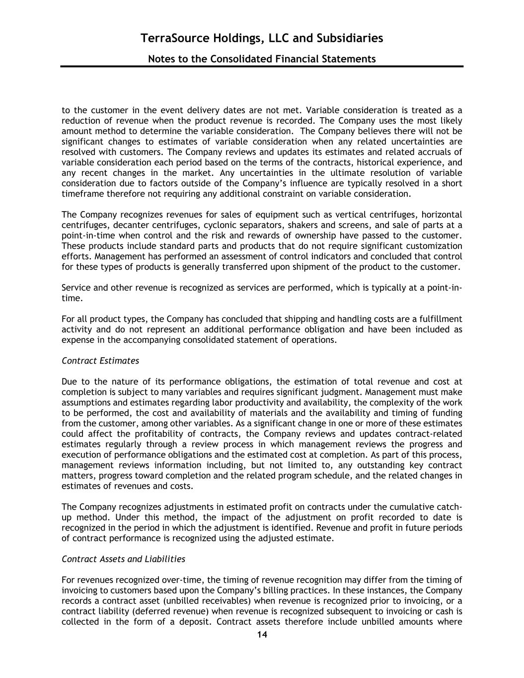 TerraSource Holdings, LLC and Subsidiaries Notes to the Consolidated Financial Statements 14 to the customer in the event delivery dates are not met. Variable consideration is treated as a reduction of revenue when the product revenue is recorded. The Company uses the most likely amount method to determine the variable consideration. The Company believes there will not be significant changes to estimates of variable consideration when any related uncertainties are resolved with customers. The Company reviews and updates its estimates and related accruals of variable consideration each period based on the terms of the contracts, historical experience, and any recent changes in the market. Any uncertainties in the ultimate resolution of variable consideration due to factors outside of the Company’s influence are typically resolved in a short timeframe therefore not requiring any additional constraint on variable consideration. The Company recognizes revenues for sales of equipment such as vertical centrifuges, horizontal centrifuges, decanter centrifuges, cyclonic separators, shakers and screens, and sale of parts at a point-in-time when control and the risk and rewards of ownership have passed to the customer. These products include standard parts and products that do not require significant customization efforts. Management has performed an assessment of control indicators and concluded that control for these types of products is generally transferred upon shipment of the product to the customer. Service and other revenue is recognized as services are performed, which is typically at a point-in- time. For all product types, the Company has concluded that shipping and handling costs are a fulfillment activity and do not represent an additional performance obligation and have been included as expense in the accompanying consolidated statement of operations. Contract Estimates Due to the nature of its performance obligations, the estimation of total revenue and cost at completion is subject to many variables and requires significant judgment. Management must make assumptions and estimates regarding labor productivity and availability, the complexity of the work to be performed, the cost and availability of materials and the availability and timing of funding from the customer, among other variables. As a significant change in one or more of these estimates could affect the profitability of contracts, the Company reviews and updates contract-related estimates regularly through a review process in which management reviews the progress and execution of performance obligations and the estimated cost at completion. As part of this process, management reviews information including, but not limited to, any outstanding key contract matters, progress toward completion and the related program schedule, and the related changes in estimates of revenues and costs. The Company recognizes adjustments in estimated profit on contracts under the cumulative catch- up method. Under this method, the impact of the adjustment on profit recorded to date is recognized in the period in which the adjustment is identified. Revenue and profit in future periods of contract performance is recognized using the adjusted estimate. Contract Assets and Liabilities For revenues recognized over-time, the timing of revenue recognition may differ from the timing of invoicing to customers based upon the Company’s billing practices. In these instances, the Company records a contract asset (unbilled receivables) when revenue is recognized prior to invoicing, or a contract liability (deferred revenue) when revenue is recognized subsequent to invoicing or cash is collected in the form of a deposit. Contract assets therefore include unbilled amounts where