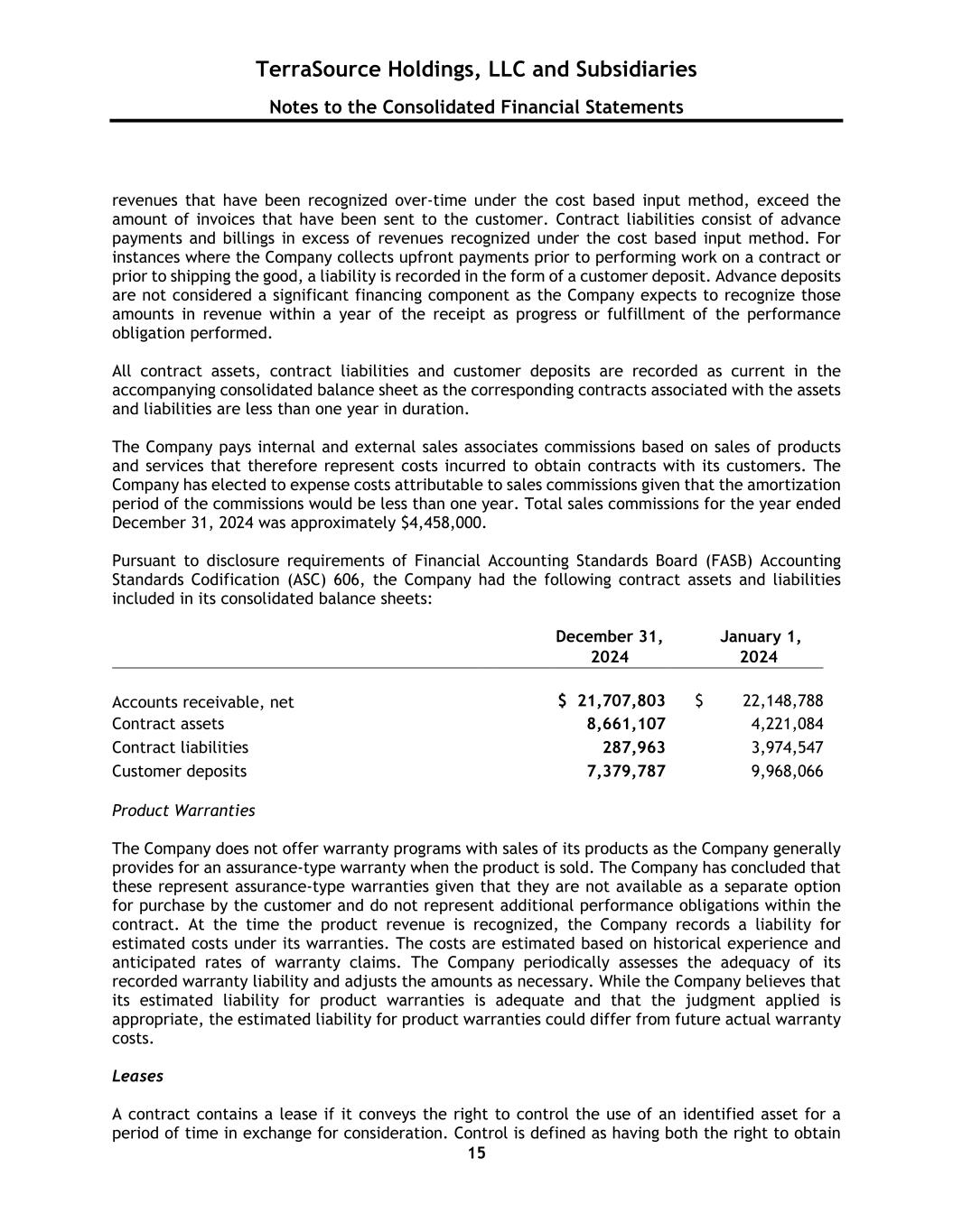 TerraSource Holdings, LLC and Subsidiaries Notes to the Consolidated Financial Statements 15 revenues that have been recognized over-time under the cost based input method, exceed the amount of invoices that have been sent to the customer. Contract liabilities consist of advance payments and billings in excess of revenues recognized under the cost based input method. For instances where the Company collects upfront payments prior to performing work on a contract or prior to shipping the good, a liability is recorded in the form of a customer deposit. Advance deposits are not considered a significant financing component as the Company expects to recognize those amounts in revenue within a year of the receipt as progress or fulfillment of the performance obligation performed. All contract assets, contract liabilities and customer deposits are recorded as current in the accompanying consolidated balance sheet as the corresponding contracts associated with the assets and liabilities are less than one year in duration. The Company pays internal and external sales associates commissions based on sales of products and services that therefore represent costs incurred to obtain contracts with its customers. The Company has elected to expense costs attributable to sales commissions given that the amortization period of the commissions would be less than one year. Total sales commissions for the year ended December 31, 2024 was approximately $4,458,000. Pursuant to disclosure requirements of Financial Accounting Standards Board (FASB) Accounting Standards Codification (ASC) 606, the Company had the following contract assets and liabilities included in its consolidated balance sheets: December 31, 2024 January 1, 2024 Accounts receivable, net $ 21,707,803 $ 22,148,788 Contract assets 8,661,107 4,221,084 Contract liabilities 287,963 3,974,547 Customer deposits 7,379,787 9,968,066 Product Warranties The Company does not offer warranty programs with sales of its products as the Company generally provides for an assurance-type warranty when the product is sold. The Company has concluded that these represent assurance-type warranties given that they are not available as a separate option for purchase by the customer and do not represent additional performance obligations within the contract. At the time the product revenue is recognized, the Company records a liability for estimated costs under its warranties. The costs are estimated based on historical experience and anticipated rates of warranty claims. The Company periodically assesses the adequacy of its recorded warranty liability and adjusts the amounts as necessary. While the Company believes that its estimated liability for product warranties is adequate and that the judgment applied is appropriate, the estimated liability for product warranties could differ from future actual warranty costs. Leases A contract contains a lease if it conveys the right to control the use of an identified asset for a period of time in exchange for consideration. Control is defined as having both the right to obtain
