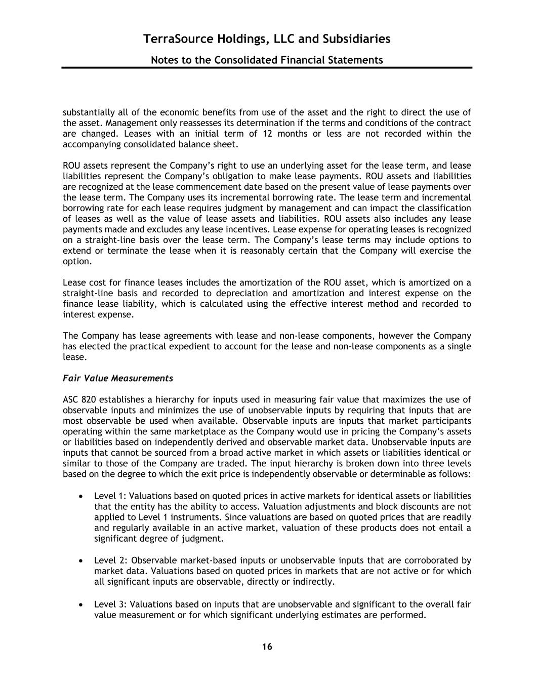TerraSource Holdings, LLC and Subsidiaries Notes to the Consolidated Financial Statements 16 substantially all of the economic benefits from use of the asset and the right to direct the use of the asset. Management only reassesses its determination if the terms and conditions of the contract are changed. Leases with an initial term of 12 months or less are not recorded within the accompanying consolidated balance sheet. ROU assets represent the Company’s right to use an underlying asset for the lease term, and lease liabilities represent the Company’s obligation to make lease payments. ROU assets and liabilities are recognized at the lease commencement date based on the present value of lease payments over the lease term. The Company uses its incremental borrowing rate. The lease term and incremental borrowing rate for each lease requires judgment by management and can impact the classification of leases as well as the value of lease assets and liabilities. ROU assets also includes any lease payments made and excludes any lease incentives. Lease expense for operating leases is recognized on a straight-line basis over the lease term. The Company’s lease terms may include options to extend or terminate the lease when it is reasonably certain that the Company will exercise the option. Lease cost for finance leases includes the amortization of the ROU asset, which is amortized on a straight-line basis and recorded to depreciation and amortization and interest expense on the finance lease liability, which is calculated using the effective interest method and recorded to interest expense. The Company has lease agreements with lease and non-lease components, however the Company has elected the practical expedient to account for the lease and non-lease components as a single lease. Fair Value Measurements ASC 820 establishes a hierarchy for inputs used in measuring fair value that maximizes the use of observable inputs and minimizes the use of unobservable inputs by requiring that inputs that are most observable be used when available. Observable inputs are inputs that market participants operating within the same marketplace as the Company would use in pricing the Company’s assets or liabilities based on independently derived and observable market data. Unobservable inputs are inputs that cannot be sourced from a broad active market in which assets or liabilities identical or similar to those of the Company are traded. The input hierarchy is broken down into three levels based on the degree to which the exit price is independently observable or determinable as follows: • Level 1: Valuations based on quoted prices in active markets for identical assets or liabilities that the entity has the ability to access. Valuation adjustments and block discounts are not applied to Level 1 instruments. Since valuations are based on quoted prices that are readily and regularly available in an active market, valuation of these products does not entail a significant degree of judgment. • Level 2: Observable market-based inputs or unobservable inputs that are corroborated by market data. Valuations based on quoted prices in markets that are not active or for which all significant inputs are observable, directly or indirectly. • Level 3: Valuations based on inputs that are unobservable and significant to the overall fair value measurement or for which significant underlying estimates are performed.