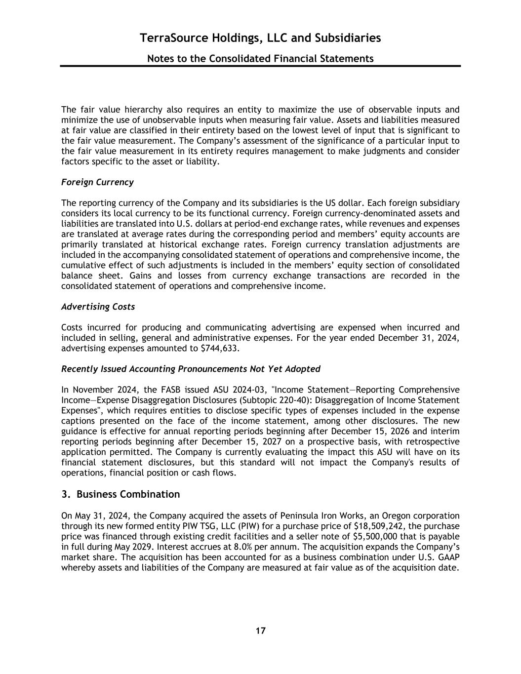 TerraSource Holdings, LLC and Subsidiaries Notes to the Consolidated Financial Statements 17 The fair value hierarchy also requires an entity to maximize the use of observable inputs and minimize the use of unobservable inputs when measuring fair value. Assets and liabilities measured at fair value are classified in their entirety based on the lowest level of input that is significant to the fair value measurement. The Company’s assessment of the significance of a particular input to the fair value measurement in its entirety requires management to make judgments and consider factors specific to the asset or liability. Foreign Currency The reporting currency of the Company and its subsidiaries is the US dollar. Each foreign subsidiary considers its local currency to be its functional currency. Foreign currency-denominated assets and liabilities are translated into U.S. dollars at period-end exchange rates, while revenues and expenses are translated at average rates during the corresponding period and members’ equity accounts are primarily translated at historical exchange rates. Foreign currency translation adjustments are included in the accompanying consolidated statement of operations and comprehensive income, the cumulative effect of such adjustments is included in the members’ equity section of consolidated balance sheet. Gains and losses from currency exchange transactions are recorded in the consolidated statement of operations and comprehensive income. Advertising Costs Costs incurred for producing and communicating advertising are expensed when incurred and included in selling, general and administrative expenses. For the year ended December 31, 2024, advertising expenses amounted to $744,633. Recently Issued Accounting Pronouncements Not Yet Adopted In November 2024, the FASB issued ASU 2024-03, "Income Statement—Reporting Comprehensive Income—Expense Disaggregation Disclosures (Subtopic 220-40): Disaggregation of Income Statement Expenses", which requires entities to disclose specific types of expenses included in the expense captions presented on the face of the income statement, among other disclosures. The new guidance is effective for annual reporting periods beginning after December 15, 2026 and interim reporting periods beginning after December 15, 2027 on a prospective basis, with retrospective application permitted. The Company is currently evaluating the impact this ASU will have on its financial statement disclosures, but this standard will not impact the Company's results of operations, financial position or cash flows. 3. Business Combination On May 31, 2024, the Company acquired the assets of Peninsula Iron Works, an Oregon corporation through its new formed entity PIW TSG, LLC (PIW) for a purchase price of $18,509,242, the purchase price was financed through existing credit facilities and a seller note of $5,500,000 that is payable in full during May 2029. Interest accrues at 8.0% per annum. The acquisition expands the Company’s market share. The acquisition has been accounted for as a business combination under U.S. GAAP whereby assets and liabilities of the Company are measured at fair value as of the acquisition date.