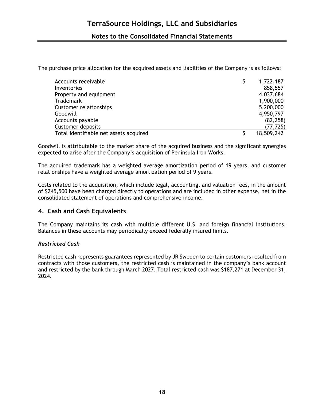 TerraSource Holdings, LLC and Subsidiaries Notes to the Consolidated Financial Statements 18 The purchase price allocation for the acquired assets and liabilities of the Company is as follows: Accounts receivable $ 1,722,187 Inventories 858,557 Property and equipment 4,037,684 Trademark 1,900,000 Customer relationships 5,200,000 Goodwill 4,950,797 Accounts payable (82,258 ) Customer deposits (77,725 ) Total identifiable net assets acquired $ 18,509,242 Goodwill is attributable to the market share of the acquired business and the significant synergies expected to arise after the Company’s acquisition of Peninsula Iron Works. The acquired trademark has a weighted average amortization period of 19 years, and customer relationships have a weighted average amortization period of 9 years. Costs related to the acquisition, which include legal, accounting, and valuation fees, in the amount of $245,500 have been charged directly to operations and are included in other expense, net in the consolidated statement of operations and comprehensive income. 4. Cash and Cash Equivalents The Company maintains its cash with multiple different U.S. and foreign financial institutions. Balances in these accounts may periodically exceed federally insured limits. Restricted Cash Restricted cash represents guarantees represented by JR Sweden to certain customers resulted from contracts with those customers, the restricted cash is maintained in the company’s bank account and restricted by the bank through March 2027. Total restricted cash was $187,271 at December 31, 2024.