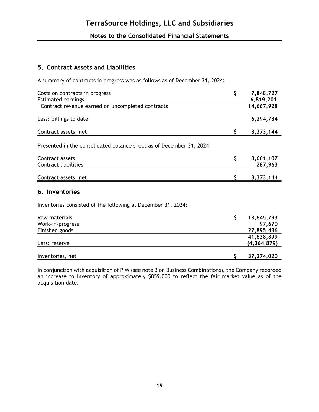 TerraSource Holdings, LLC and Subsidiaries Notes to the Consolidated Financial Statements 19 5. Contract Assets and Liabilities A summary of contracts in progress was as follows as of December 31, 2024: Costs on contracts in progress $ 7,848,727 Estimated earnings 6,819,201 Contract revenue earned on uncompleted contracts 14,667,928 Less: billings to date 6,294,784 Contract assets, net $ 8,373,144 Presented in the consolidated balance sheet as of December 31, 2024: Contract assets $ 8,661,107 Contract liabilities 287,963 Contract assets, net $ 8,373,144 6. Inventories Inventories consisted of the following at December 31, 2024: Raw materials $ 13,645,793 Work-in-progress 97,670 Finished goods 27,895,436 41,638,899 Less: reserve (4,364,879) Inventories, net $ 37,274,020 In conjunction with acquisition of PIW (see note 3 on Business Combinations), the Company recorded an increase to inventory of approximately $859,000 to reflect the fair market value as of the acquisition date.