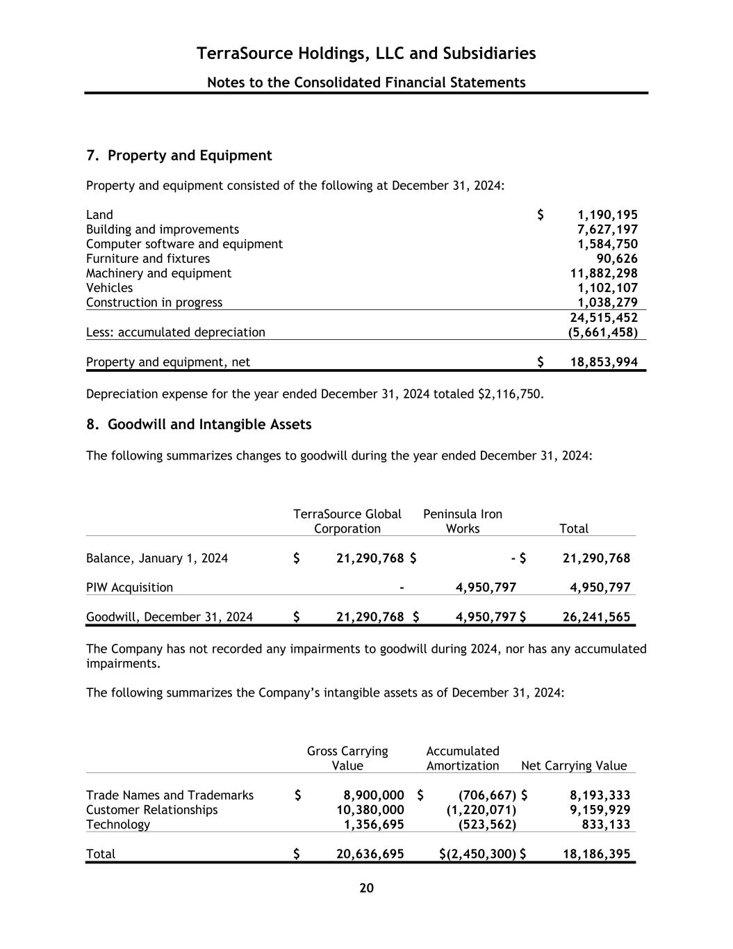 TerraSource Holdings, LLC and Subsidiaries Notes to the Consolidated Financial Statements 20 7. Property and Equipment Property and equipment consisted of the following at December 31, 2024: Land $ 1,190,195 Building and improvements 7,627,197 Computer software and equipment 1,584,750 Furniture and fixtures 90,626 Machinery and equipment 11,882,298 Vehicles 1,102,107 Construction in progress 1,038,279 24,515,452 Less: accumulated depreciation (5,661,458) Property and equipment, net $ 18,853,994 Depreciation expense for the year ended December 31, 2024 totaled $2,116,750. 8. Goodwill and Intangible Assets The following summarizes changes to goodwill during the year ended December 31, 2024: TerraSource Global Corporation Peninsula Iron Works Total Balance, January 1, 2024 $ 21,290,768 $ - $ 21,290,768 PIW Acquisition - 4,950,797 4,950,797 Goodwill, December 31, 2024 $ 21,290,768 $ 4,950,797 $ 26,241,565 The Company has not recorded any impairments to goodwill during 2024, nor has any accumulated impairments. The following summarizes the Company’s intangible assets as of December 31, 2024: Gross Carrying Value Accumulated Amortization Net Carrying Value Trade Names and Trademarks $ 8,900,000 $ (706,667) $ 8,193,333 Customer Relationships 10,380,000 (1,220,071) 9,159,929 Technology 1,356,695 (523,562) 833,133 Total $ 20,636,695 $(2,450,300) $ 18,186,395