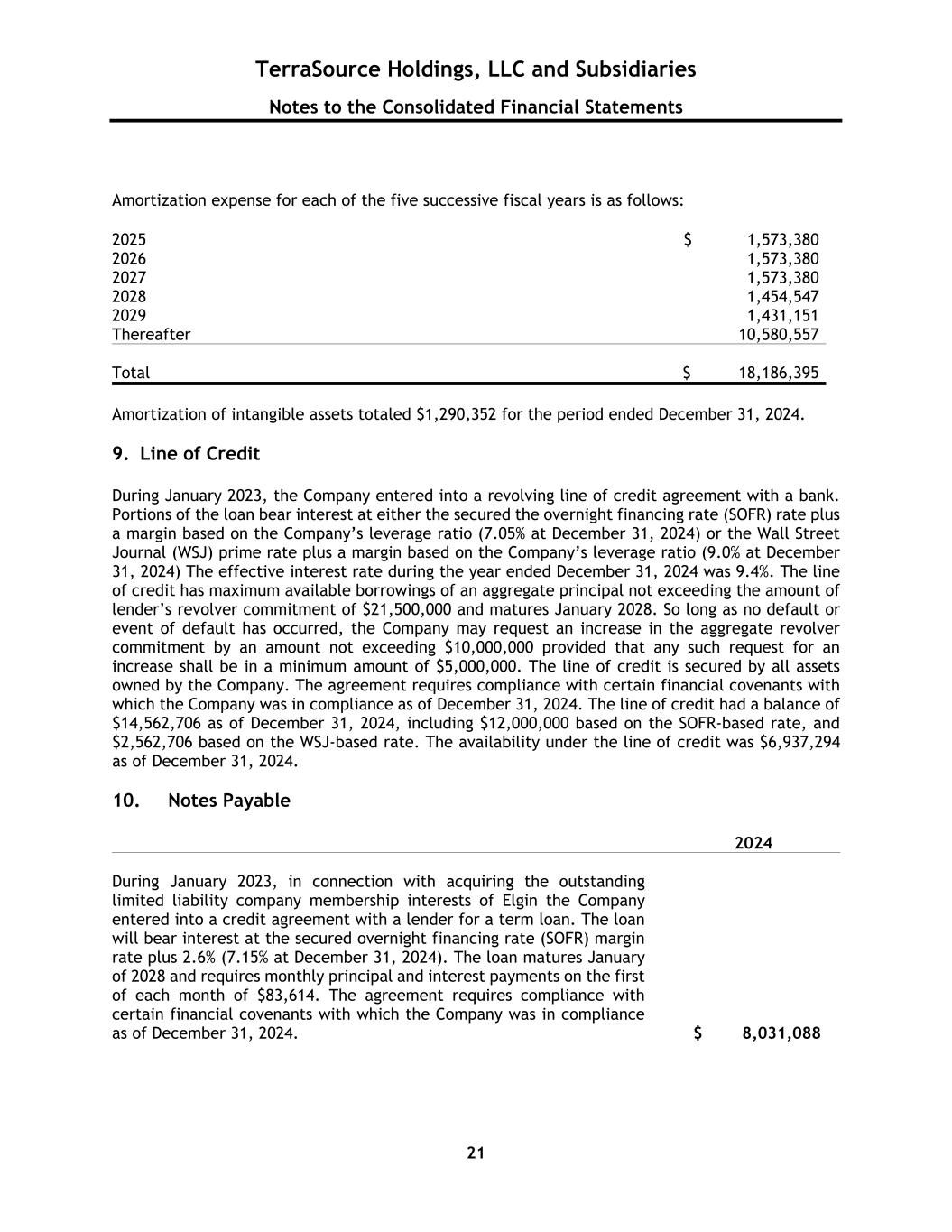 TerraSource Holdings, LLC and Subsidiaries Notes to the Consolidated Financial Statements 21 Amortization expense for each of the five successive fiscal years is as follows: 2025 $ 1,573,380 2026 1,573,380 2027 1,573,380 2028 1,454,547 2029 1,431,151 Thereafter 10,580,557 Total $ 18,186,395 Amortization of intangible assets totaled $1,290,352 for the period ended December 31, 2024. 9. Line of Credit During January 2023, the Company entered into a revolving line of credit agreement with a bank. Portions of the loan bear interest at either the secured the overnight financing rate (SOFR) rate plus a margin based on the Company’s leverage ratio (7.05% at December 31, 2024) or the Wall Street Journal (WSJ) prime rate plus a margin based on the Company’s leverage ratio (9.0% at December 31, 2024) The effective interest rate during the year ended December 31, 2024 was 9.4%. The line of credit has maximum available borrowings of an aggregate principal not exceeding the amount of lender’s revolver commitment of $21,500,000 and matures January 2028. So long as no default or event of default has occurred, the Company may request an increase in the aggregate revolver commitment by an amount not exceeding $10,000,000 provided that any such request for an increase shall be in a minimum amount of $5,000,000. The line of credit is secured by all assets owned by the Company. The agreement requires compliance with certain financial covenants with which the Company was in compliance as of December 31, 2024. The line of credit had a balance of $14,562,706 as of December 31, 2024, including $12,000,000 based on the SOFR-based rate, and $2,562,706 based on the WSJ-based rate. The availability under the line of credit was $6,937,294 as of December 31, 2024. 10. Notes Payable 2024 During January 2023, in connection with acquiring the outstanding limited liability company membership interests of Elgin the Company entered into a credit agreement with a lender for a term loan. The loan will bear interest at the secured overnight financing rate (SOFR) margin rate plus 2.6% (7.15% at December 31, 2024). The loan matures January of 2028 and requires monthly principal and interest payments on the first of each month of $83,614. The agreement requires compliance with certain financial covenants with which the Company was in compliance as of December 31, 2024. $ 8,031,088