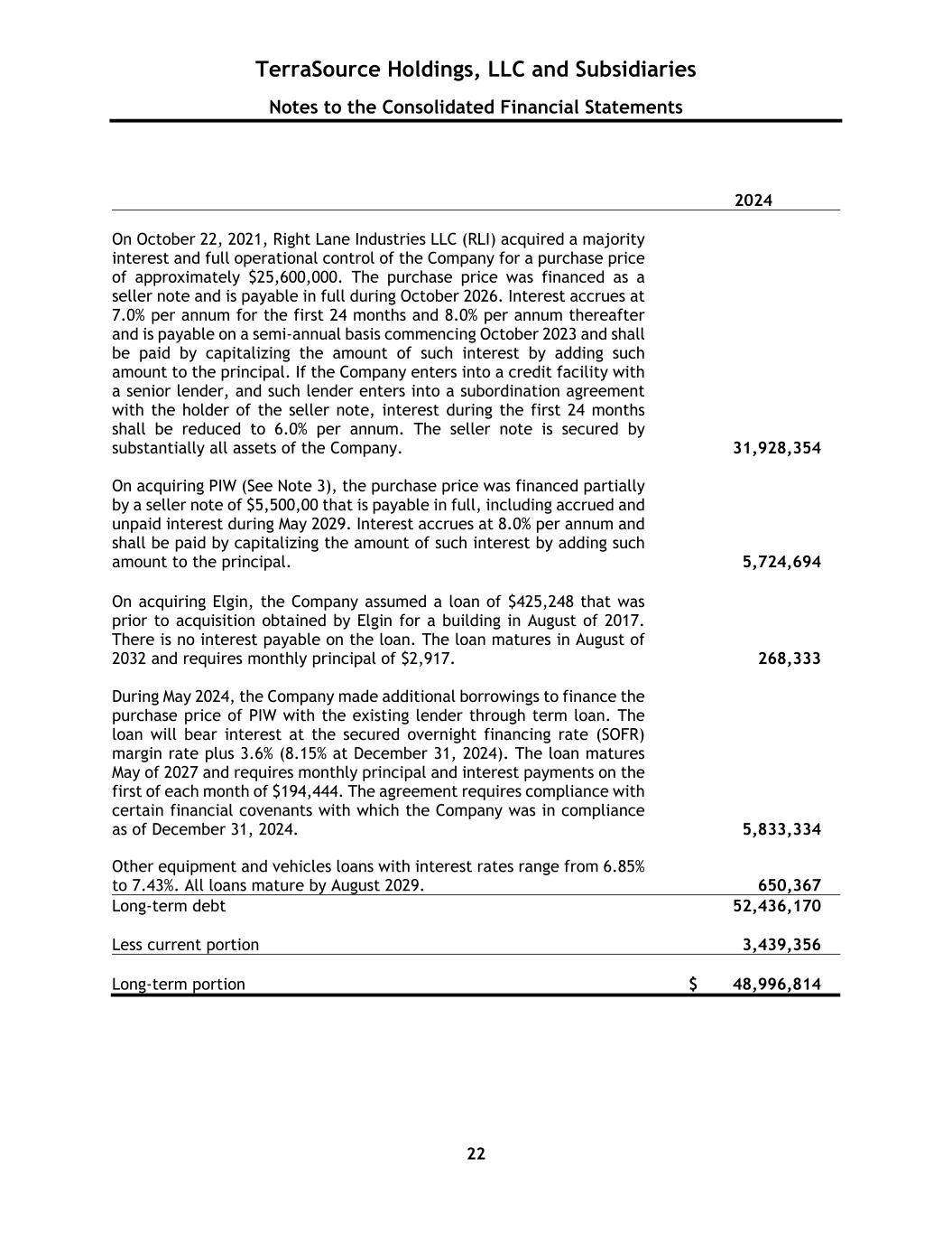 TerraSource Holdings, LLC and Subsidiaries Notes to the Consolidated Financial Statements 22 2024 On October 22, 2021, Right Lane Industries LLC (RLI) acquired a majority interest and full operational control of the Company for a purchase price of approximately $25,600,000. The purchase price was financed as a seller note and is payable in full during October 2026. Interest accrues at 7.0% per annum for the first 24 months and 8.0% per annum thereafter and is payable on a semi-annual basis commencing October 2023 and shall be paid by capitalizing the amount of such interest by adding such amount to the principal. If the Company enters into a credit facility with a senior lender, and such lender enters into a subordination agreement with the holder of the seller note, interest during the first 24 months shall be reduced to 6.0% per annum. The seller note is secured by substantially all assets of the Company. 31,928,354 On acquiring PIW (See Note 3), the purchase price was financed partially by a seller note of $5,500,00 that is payable in full, including accrued and unpaid interest during May 2029. Interest accrues at 8.0% per annum and shall be paid by capitalizing the amount of such interest by adding such amount to the principal. 5,724,694 On acquiring Elgin, the Company assumed a loan of $425,248 that was prior to acquisition obtained by Elgin for a building in August of 2017. There is no interest payable on the loan. The loan matures in August of 2032 and requires monthly principal of $2,917. 268,333 During May 2024, the Company made additional borrowings to finance the purchase price of PIW with the existing lender through term loan. The loan will bear interest at the secured overnight financing rate (SOFR) margin rate plus 3.6% (8.15% at December 31, 2024). The loan matures May of 2027 and requires monthly principal and interest payments on the first of each month of $194,444. The agreement requires compliance with certain financial covenants with which the Company was in compliance as of December 31, 2024. 5,833,334 Other equipment and vehicles loans with interest rates range from 6.85% to 7.43%. All loans mature by August 2029. 650,367 Long-term debt 52,436,170 Less current portion 3,439,356 Long-term portion $ 48,996,814
