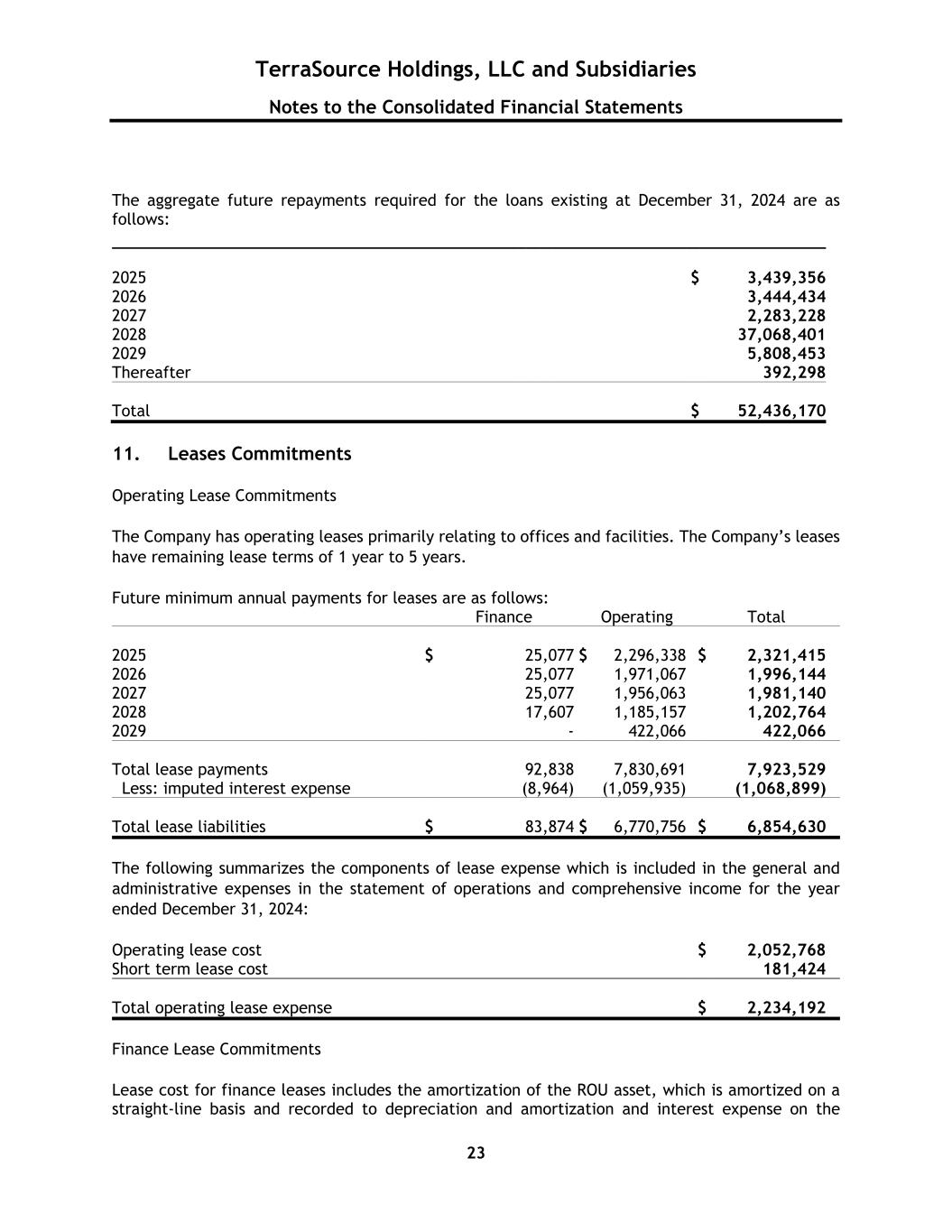 TerraSource Holdings, LLC and Subsidiaries Notes to the Consolidated Financial Statements 23 The aggregate future repayments required for the loans existing at December 31, 2024 are as follows: 2025 $ 3,439,356 2026 3,444,434 2027 2,283,228 2028 37,068,401 2029 5,808,453 Thereafter 392,298 Total $ 52,436,170 11. Leases Commitments Operating Lease Commitments The Company has operating leases primarily relating to offices and facilities. The Company’s leases have remaining lease terms of 1 year to 5 years. Future minimum annual payments for leases are as follows: Finance Operating Total 2025 $ 25,077 $ 2,296,338 $ 2,321,415 2026 25,077 1,971,067 1,996,144 2027 25,077 1,956,063 1,981,140 2028 17,607 1,185,157 1,202,764 2029 - 422,066 422,066 Total lease payments 92,838 7,830,691 7,923,529 Less: imputed interest expense (8,964) (1,059,935) (1,068,899) Total lease liabilities $ 83,874 $ 6,770,756 $ 6,854,630 The following summarizes the components of lease expense which is included in the general and administrative expenses in the statement of operations and comprehensive income for the year ended December 31, 2024: Operating lease cost $ 2,052,768 Short term lease cost 181,424 Total operating lease expense $ 2,234,192 Finance Lease Commitments Lease cost for finance leases includes the amortization of the ROU asset, which is amortized on a straight-line basis and recorded to depreciation and amortization and interest expense on the