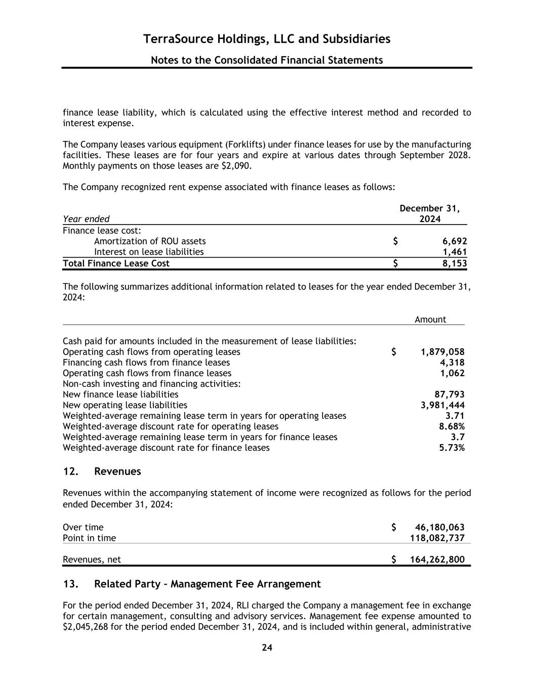 TerraSource Holdings, LLC and Subsidiaries Notes to the Consolidated Financial Statements 24 finance lease liability, which is calculated using the effective interest method and recorded to interest expense. The Company leases various equipment (Forklifts) under finance leases for use by the manufacturing facilities. These leases are for four years and expire at various dates through September 2028. Monthly payments on those leases are $2,090. The Company recognized rent expense associated with finance leases as follows: Year ended December 31, 2024 Finance lease cost: Amortization of ROU assets $ 6,692 Interest on lease liabilities 1,461 Total Finance Lease Cost $ 8,153 The following summarizes additional information related to leases for the year ended December 31, 2024: Amount Cash paid for amounts included in the measurement of lease liabilities: Operating cash flows from operating leases $ 1,879,058 Financing cash flows from finance leases 4,318 Operating cash flows from finance leases 1,062 Non-cash investing and financing activities: New finance lease liabilities 87,793 New operating lease liabilities 3,981,444 Weighted-average remaining lease term in years for operating leases 3.71 Weighted-average discount rate for operating leases 8.68% Weighted-average remaining lease term in years for finance leases 3.7 Weighted-average discount rate for finance leases 5.73% 12. Revenues Revenues within the accompanying statement of income were recognized as follows for the period ended December 31, 2024: Over time $ 46,180,063 Point in time 118,082,737 Revenues, net $ 164,262,800 13. Related Party – Management Fee Arrangement For the period ended December 31, 2024, RLI charged the Company a management fee in exchange for certain management, consulting and advisory services. Management fee expense amounted to $2,045,268 for the period ended December 31, 2024, and is included within general, administrative