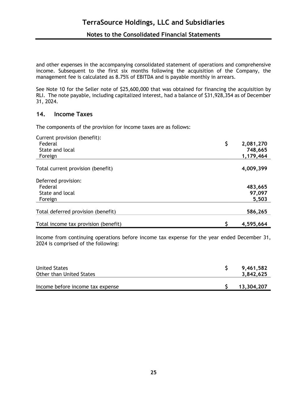 TerraSource Holdings, LLC and Subsidiaries Notes to the Consolidated Financial Statements 25 and other expenses in the accompanying consolidated statement of operations and comprehensive income. Subsequent to the first six months following the acquisition of the Company, the management fee is calculated as 8.75% of EBITDA and is payable monthly in arrears. See Note 10 for the Seller note of $25,600,000 that was obtained for financing the acquisition by RLI. The note payable, including capitalized interest, had a balance of $31,928,354 as of December 31, 2024. 14. Income Taxes The components of the provision for income taxes are as follows: Current provision (benefit): Federal $ 2,081,270 State and local 748,665 Foreign 1,179,464 Total current provision (benefit) 4,009,399 Deferred provision: Federal 483,665 State and local 97,097 Foreign 5,503 Total deferred provision (benefit) 586,265 Total income tax provision (benefit) $ 4,595,664 Income from continuing operations before income tax expense for the year ended December 31, 2024 is comprised of the following: United States $ 9,461,582 Other than United States 3,842,625 Income before income tax expense $ 13,304,207