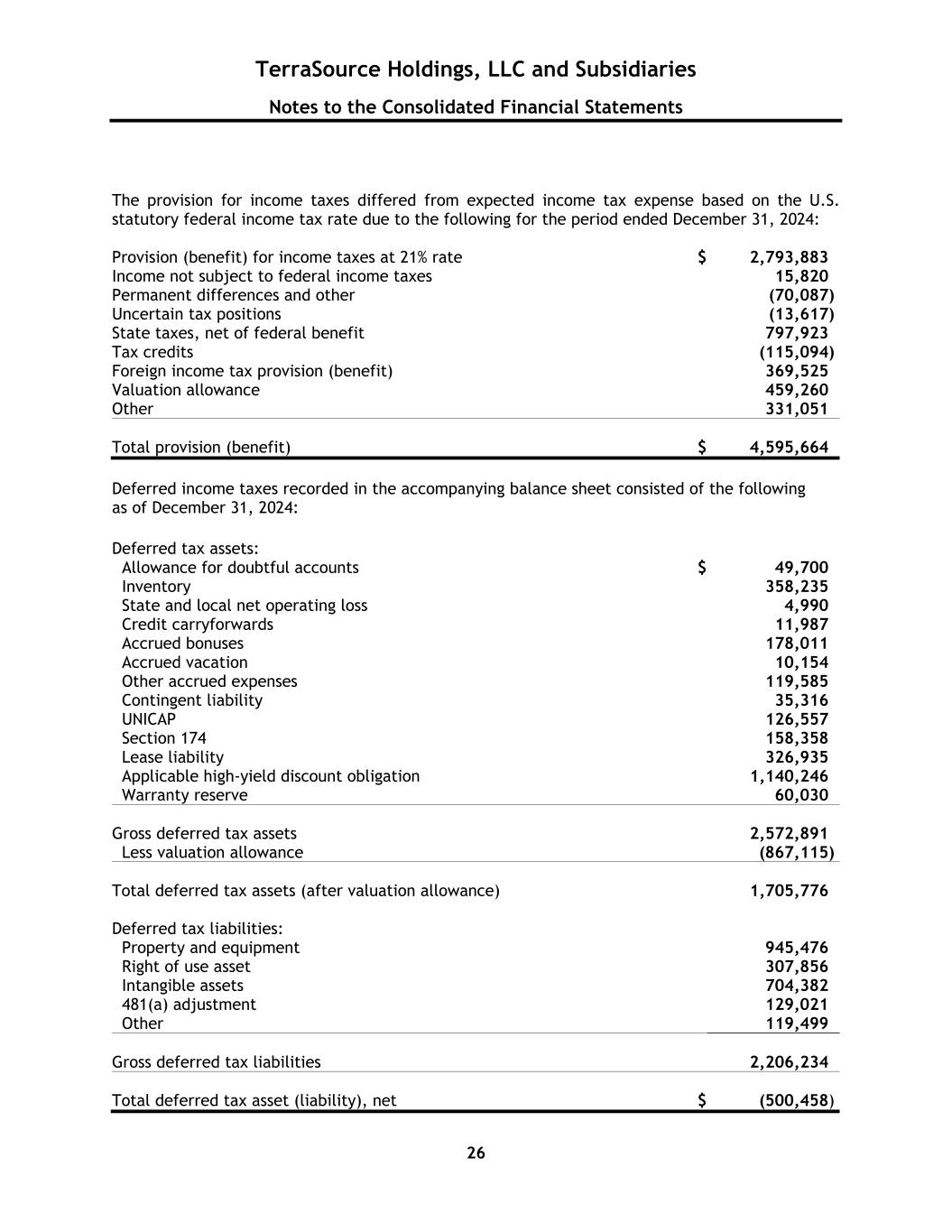 TerraSource Holdings, LLC and Subsidiaries Notes to the Consolidated Financial Statements 26 The provision for income taxes differed from expected income tax expense based on the U.S. statutory federal income tax rate due to the following for the period ended December 31, 2024: Provision (benefit) for income taxes at 21% rate $ 2,793,883 Income not subject to federal income taxes 15,820 Permanent differences and other (70,087 ) Uncertain tax positions (13,617 ) State taxes, net of federal benefit 797,923 Tax credits (115,094 ) Foreign income tax provision (benefit) 369,525 Valuation allowance 459,260 Other 331,051 Total provision (benefit) $ 4,595,664 Deferred income taxes recorded in the accompanying balance sheet consisted of the following as of December 31, 2024: Deferred tax assets: Allowance for doubtful accounts $ 49,700 Inventory 358,235 State and local net operating loss 4,990 Credit carryforwards 11,987 Accrued bonuses 178,011 Accrued vacation 10,154 Other accrued expenses 119,585 Contingent liability 35,316 UNICAP 126,557 Section 174 158,358 Lease liability 326,935 Applicable high-yield discount obligation 1,140,246 Warranty reserve 60,030 Gross deferred tax assets 2,572,891 Less valuation allowance (867,115 ) Total deferred tax assets (after valuation allowance) 1,705,776 Deferred tax liabilities: Property and equipment 945,476 Right of use asset 307,856 Intangible assets 704,382 481(a) adjustment 129,021 Other 119,499 Gross deferred tax liabilities 2,206,234 Total deferred tax asset (liability), net $ (500,458 )