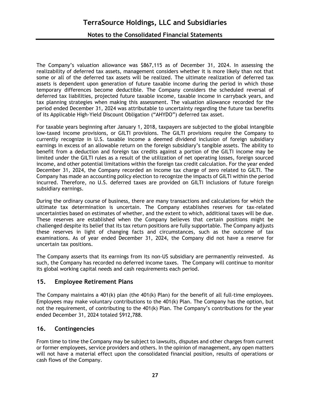 TerraSource Holdings, LLC and Subsidiaries Notes to the Consolidated Financial Statements 27 The Company’s valuation allowance was $867,115 as of December 31, 2024. In assessing the realizability of deferred tax assets, management considers whether it is more likely than not that some or all of the deferred tax assets will be realized. The ultimate realization of deferred tax assets is dependent upon generation of future taxable income during the period in which those temporary differences become deductible. The Company considers the scheduled reversal of deferred tax liabilities, projected future taxable income, taxable income in carryback years, and tax planning strategies when making this assessment. The valuation allowance recorded for the period ended December 31, 2024 was attributable to uncertainty regarding the future tax benefits of its Applicable High-Yield Discount Obligation (“AHYDO”) deferred tax asset. For taxable years beginning after January 1, 2018, taxpayers are subjected to the global intangible low-taxed income provisions, or GILTI provisions. The GILTI provisions require the Company to currently recognize in U.S. taxable income a deemed dividend inclusion of foreign subsidiary earnings in excess of an allowable return on the foreign subsidiary’s tangible assets. The ability to benefit from a deduction and foreign tax credits against a portion of the GILTI income may be limited under the GILTI rules as a result of the utilization of net operating losses, foreign sourced income, and other potential limitations within the foreign tax credit calculation. For the year ended December 31, 2024, the Company recorded an income tax charge of zero related to GILTI. The Company has made an accounting policy election to recognize the impacts of GILTI within the period incurred. Therefore, no U.S. deferred taxes are provided on GILTI inclusions of future foreign subsidiary earnings. During the ordinary course of business, there are many transactions and calculations for which the ultimate tax determination is uncertain. The Company establishes reserves for tax-related uncertainties based on estimates of whether, and the extent to which, additional taxes will be due. These reserves are established when the Company believes that certain positions might be challenged despite its belief that its tax return positions are fully supportable. The Company adjusts these reserves in light of changing facts and circumstances, such as the outcome of tax examinations. As of year ended December 31, 2024, the Company did not have a reserve for uncertain tax positions. The Company asserts that its earnings from its non-US subsidiary are permanently reinvested. As such, the Company has recorded no deferred income taxes. The Company will continue to monitor its global working capital needs and cash requirements each period. 15. Employee Retirement Plans The Company maintains a 401(k) plan (the 401(k) Plan) for the benefit of all full-time employees. Employees may make voluntary contributions to the 401(k) Plan. The Company has the option, but not the requirement, of contributing to the 401(k) Plan. The Company’s contributions for the year ended December 31, 2024 totaled $912,788. 16. Contingencies From time to time the Company may be subject to lawsuits, disputes and other charges from current or former employees, service providers and others. In the opinion of management, any open matters will not have a material effect upon the consolidated financial position, results of operations or cash flows of the Company.