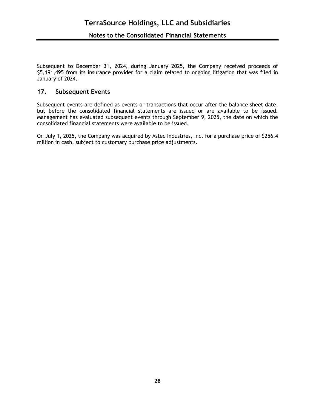 TerraSource Holdings, LLC and Subsidiaries Notes to the Consolidated Financial Statements 28 Subsequent to December 31, 2024, during January 2025, the Company received proceeds of $5,191,495 from its insurance provider for a claim related to ongoing litigation that was filed in January of 2024. 17. Subsequent Events Subsequent events are defined as events or transactions that occur after the balance sheet date, but before the consolidated financial statements are issued or are available to be issued. Management has evaluated subsequent events through September 9, 2025, the date on which the consolidated financial statements were available to be issued. On July 1, 2025, the Company was acquired by Astec Industries, Inc. for a purchase price of $256.4 million in cash, subject to customary purchase price adjustments.