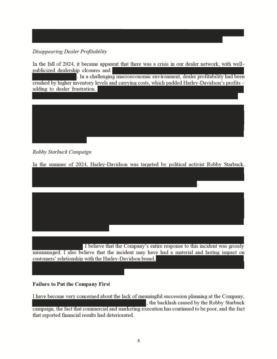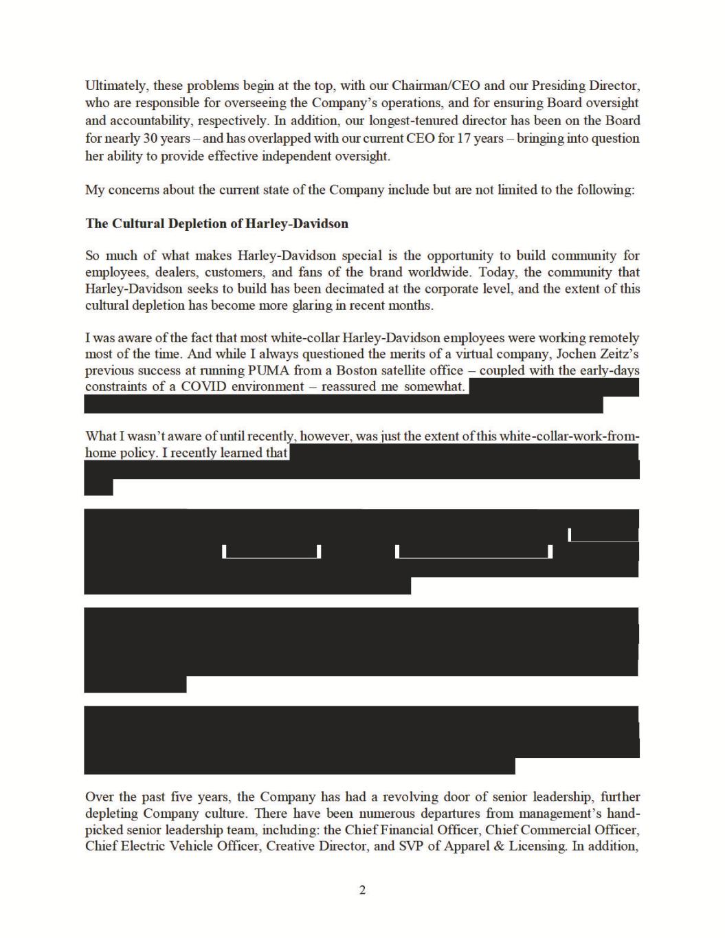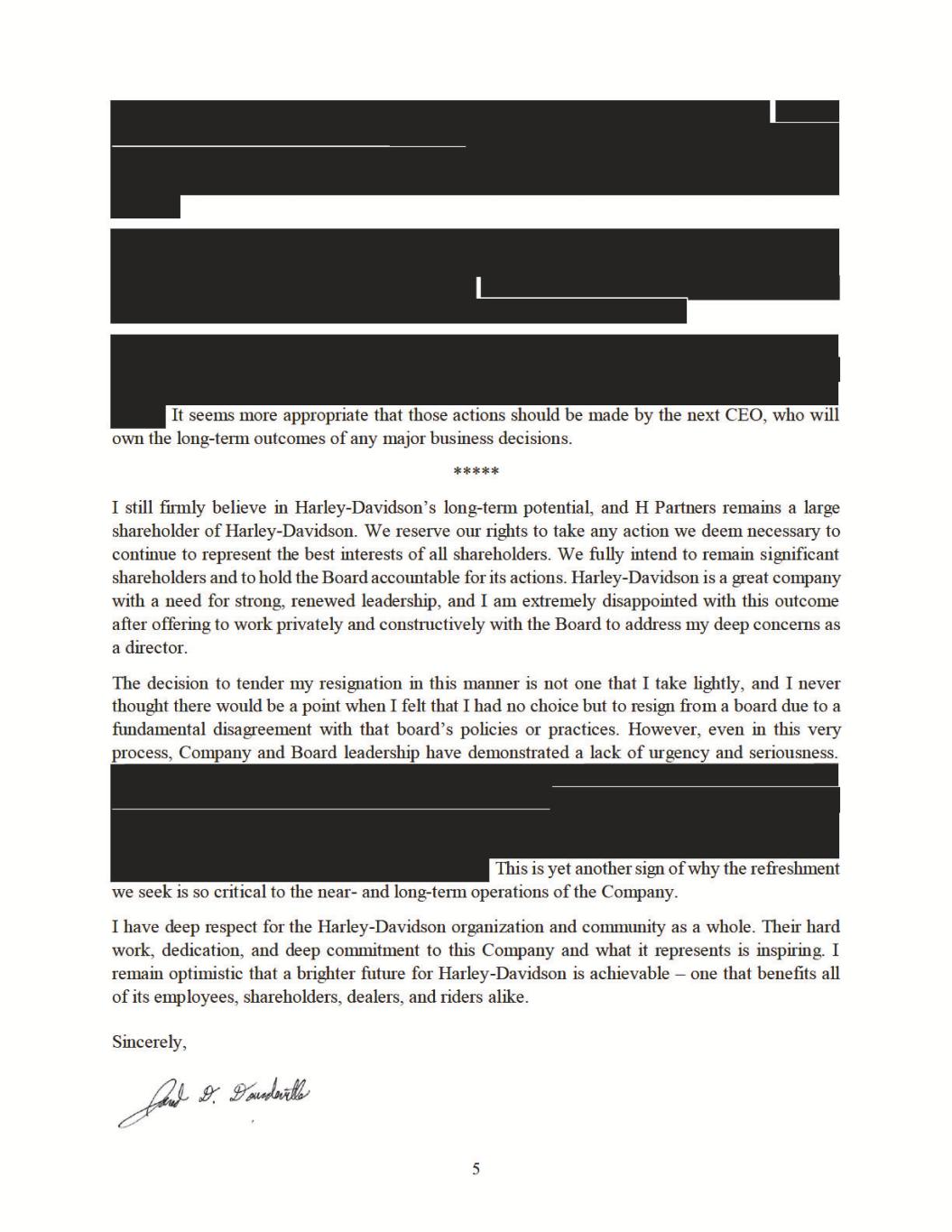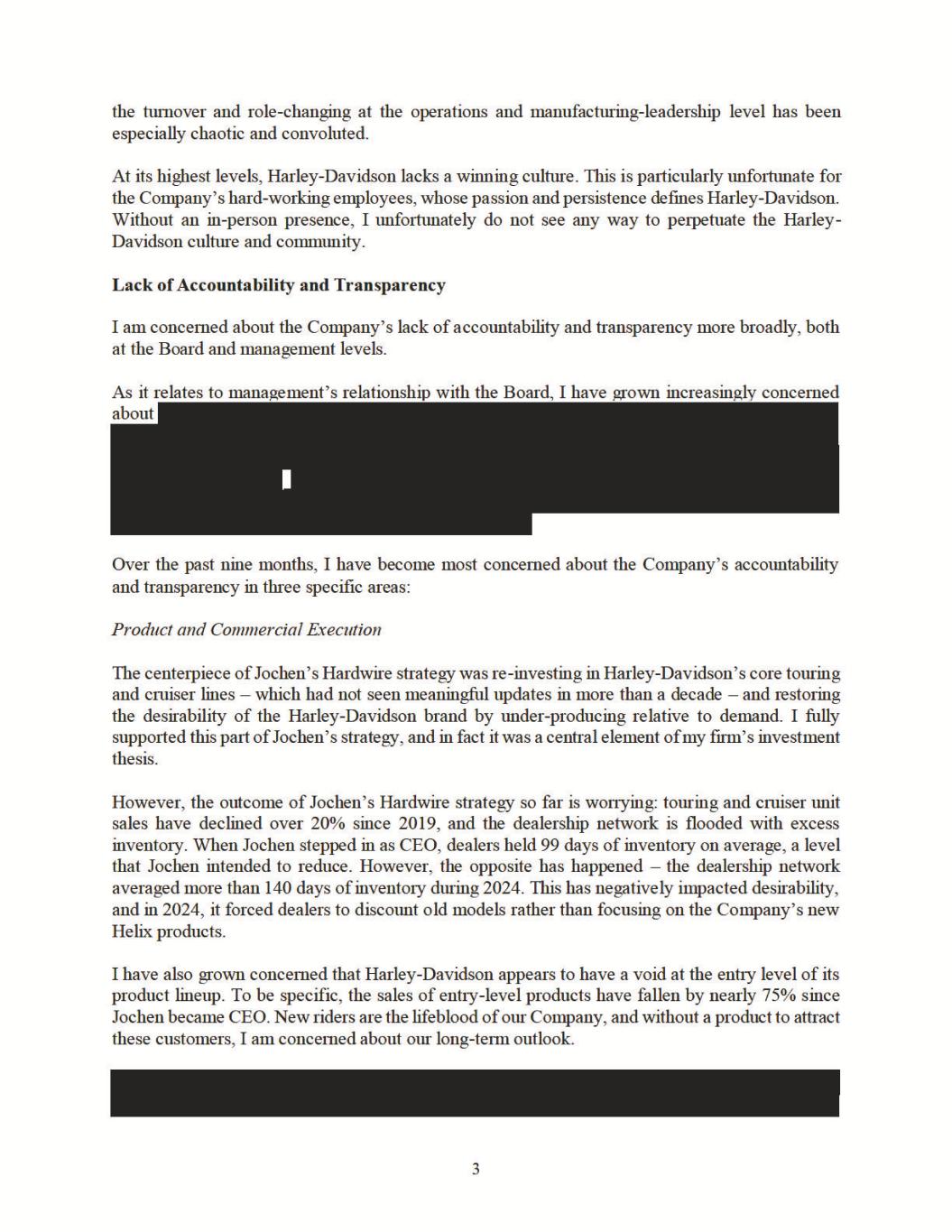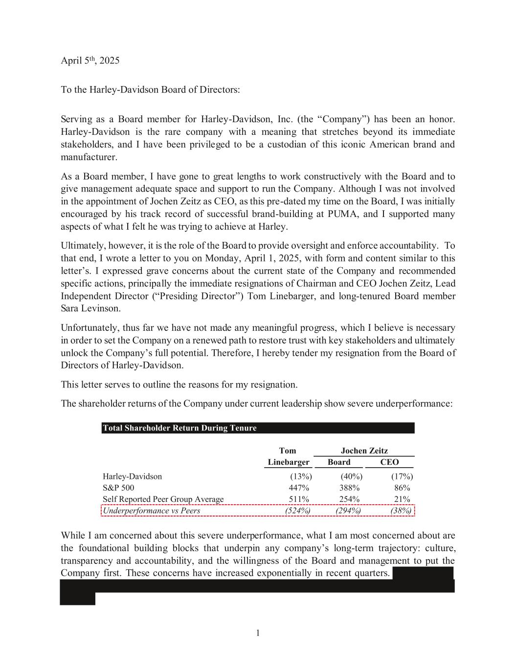 1 April 5th, 2025 To the Harley-Davidson Board of Directors: Serving as a Board member for Harley-Davidson, Inc. (the “Company”) has been an honor. Harley-Davidson is the rare company with a meaning that stretches beyond its immediate stakeholders, and I have been privileged to be a custodian of this iconic American brand and manufacturer. As a Board member, I have gone to great lengths to work constructively with the Board and to give management adequate space and support to run the Company. Although I was not involved in the appointment of Jochen Zeitz as CEO, as this pre-dated my time on the Board, I was initially encouraged by his track record of successful brand-building at PUMA, and I supported many aspects of what I felt he was trying to achieve at Harley. Ultimately, however, it is the role of the Board to provide oversight and enforce accountability. To that end, I wrote a letter to you on Monday, April 1, 2025, with form and content similar to this letter’s. I expressed grave concerns about the current state of the Company and recommended specific actions, principally the immediate resignations of Chairman and CEO Jochen Zeitz, Lead Independent Director (“Presiding Director”) Tom Linebarger, and long-tenured Board member Sara Levinson. Unfortunately, thus far we have not made any meaningful progress, which I believe is necessary in order to set the Company on a renewed path to restore trust with key stakeholders and ultimately unlock the Company’s full potential. Therefore, I hereby tender my resignation from the Board of Directors of Harley-Davidson. This letter serves to outline the reasons for my resignation. The shareholder returns of the Company under current leadership show severe underperformance: While I am concerned about this severe underperformance, what I am most concerned about are the foundational building blocks that underpin any company’s long-term trajectory: culture, transparency and accountability, and the willingness of the Board and management to put the Company first. These concerns have increased exponentially in recent quarters. Total Shareholder Return During Tenure Tom Jochen Zeitz Linebarger Board CEO Harley-Davidson (13%) (40%) (17%) S&P 500 447% 388% 86% Self Reported Peer Group Average 511% 254% 21% Underperformance vs Peers (524%) (294%) (38%)