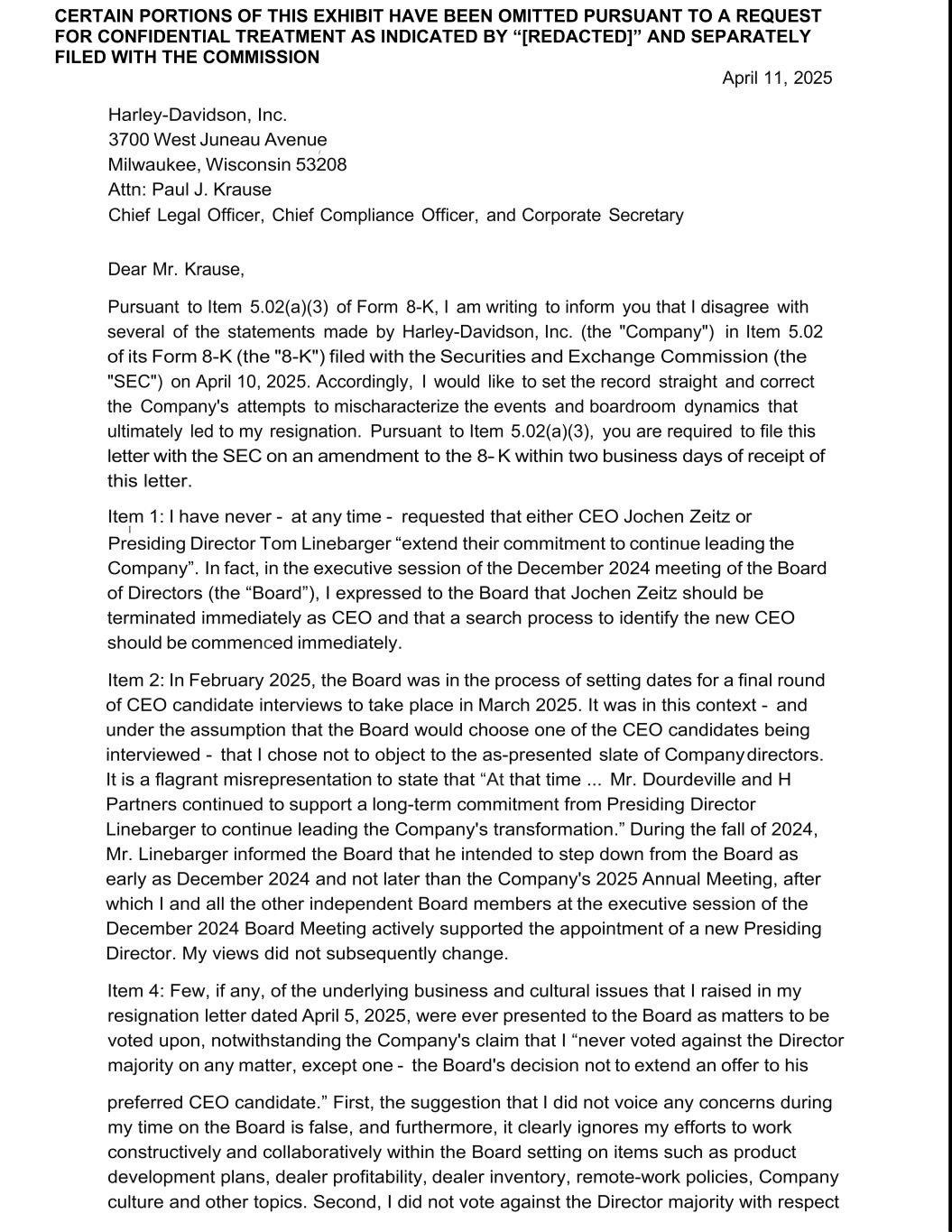 CERTAIN PORTIONS OF THIS EXHIBIT HAVE BEEN OMITTED PURSUANT TO A REQUEST FOR CONFIDENTIAL TREATMENT AS INDICATED BY “[REDACTED]” AND SEPARATELY FILED WITH THE COMMISSION April 11, 2025 Harley-Davidson, Inc. 3700 West Juneau Avenue ( Milwaukee, Wisconsin 53208 Attn: Paul J. Krause Chief Legal Officer, Chief Compliance Officer, and Corporate Secretary Dear Mr. Krause, Pursuant to Item 5.02(a)(3) of Form 8-K, I am writing to inform you that I disagree with several of the statements made by Harley-Davidson, Inc. (the "Company") in Item 5.02 of its Form 8-K (the "8-K") filed with the Securities and Exchange Commission (the "SEC") on April 10, 2025. Accordingly, I would like to set the record straight and correct the Company's attempts to mischaracterize the events and boardroom dynamics that ultimately led to my resignation. Pursuant to Item 5.02(a)(3), you are required to file this letter with the SEC on an amendment to the 8-K within two business days of receipt of this letter. Item 1: I have never - at any time - requested that either CEO Jochen Zeitz or I Presiding Director Tom Linebarger “extend their commitment to continue leading the Company”. In fact, in the executive session of the December 2024 meeting of the Board of Directors (the “Board”), I expressed to the Board that Jochen Zeitz should be terminated immediately as CEO and that a search process to identify the new CEO should be commenced immediately. Item 2: In February 2025, the Board was in the process of setting dates for a final round of CEO candidate interviews to take place in March 2025. It was in this context - and under the assumption that the Board would choose one of the CEO candidates being interviewed - that I chose not to object to the as-presented slate of Company directors. It is a flagrant misrepresentation to state that “At that time ... Mr. Dourdeville and H Partners continued to support a long-term commitment from Presiding Director Linebarger to continue leading the Company's transformation.” During the fall of 2024, Mr. Linebarger informed the Board that he intended to step down from the Board as early as December 2024 and not later than the Company's 2025 Annual Meeting, after which I and all the other independent Board members at the executive session of the December 2024 Board Meeting actively supported the appointment of a new Presiding Director. My views did not subsequently change. Item 4: Few, if any, of the underlying business and cultural issues that I raised in my resignation letter dated April 5, 2025, were ever presented to the Board as matters to be voted upon, notwithstanding the Company's claim that I “never voted against the Director majority on any matter, except one - the Board's decision not to extend an offer to his preferred CEO candidate.” First, the suggestion that I did not voice any concerns during my time on the Board is false, and furthermore, it clearly ignores my efforts to work constructively and collaboratively within the Board setting on items such as product development plans, dealer profitability, dealer inventory, remote-work policies, Company culture and other topics. Second, I did not vote against the Director majority with respect
