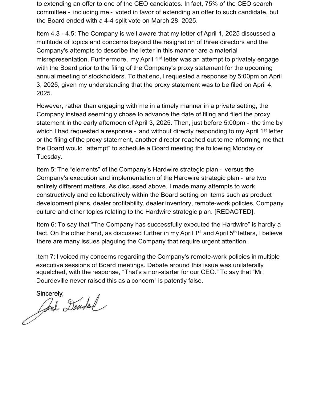 to extending an offer to one of the CEO candidates. In fact, 75% of the CEO search committee - including me - voted in favor of extending an offer to such candidate, but the Board ended with a 4-4 split vote on March 28, 2025. Item 4.3 - 4.5: The Company is well aware that my letter of April 1, 2025 discussed a multitude of topics and concerns beyond the resignation of three directors and the Company's attempts to describe the letter in this manner are a material misrepresentation. Furthermore, my April 1st letter was an attempt to privately engage with the Board prior to the filing of the Company's proxy statement for the upcoming annual meeting of stockholders. To that end, I requested a response by 5:00pm on April 3, 2025, given my understanding that the proxy statement was to be filed on April 4, 2025. However, rather than engaging with me in a timely manner in a private setting, the Company instead seemingly chose to advance the date of filing and filed the proxy statement in the early afternoon of April 3, 2025. Then, just before 5:00pm - the time by which I had requested a response - and without directly responding to my April 1st letter or the filing of the proxy statement, another director reached out to me informing me that the Board would “attempt” to schedule a Board meeting the following Monday or Tuesday. Item 5: The “elements” of the Company's Hardwire strategic plan - versus the Company's execution and implementation of the Hardwire strategic plan - are two entirely different matters. As discussed above, I made many attempts to work constructively and collaboratively within the Board setting on items such as product development plans, dealer profitability, dealer inventory, remote-work policies, Company culture and other topics relating to the Hardwire strategic plan. [REDACTED]. Item 6: To say that “The Company has successfully executed the Hardwire” is hardly a fact. On the other hand, as discussed further in my April 1st and April 5th letters, I believe there are many issues plaguing the Company that require urgent attention. Item 7: I voiced my concerns regarding the Company's remote-work policies in multiple executive sessions of Board meetings. Debate around this issue was unilaterally squelched, with the response, “That's a non-starter for our CEO.” To say that “Mr. Dourdeville never raised this as a concern” is patently false.