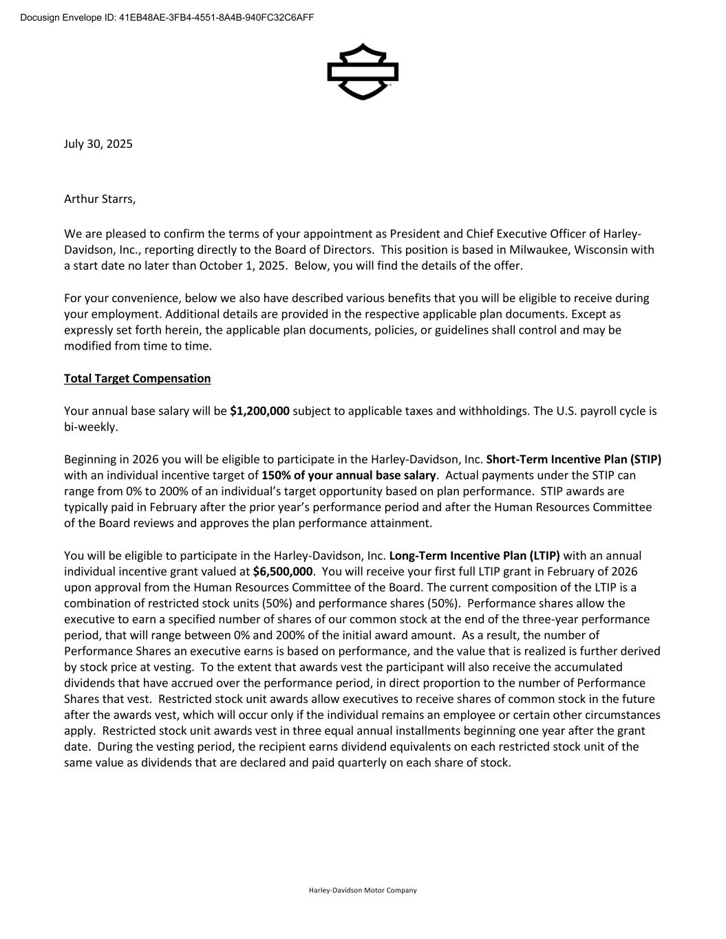 Harley-Davidson Motor Company July 30, 2025 Arthur Starrs, We are pleased to confirm the terms of your appointment as President and Chief Executive Officer of Harley- Davidson, Inc., reporting directly to the Board of Directors. This position is based in Milwaukee, Wisconsin with a start date no later than October 1, 2025. Below, you will find the details of the offer. For your convenience, below we also have described various benefits that you will be eligible to receive during your employment. Additional details are provided in the respective applicable plan documents. Except as expressly set forth herein, the applicable plan documents, policies, or guidelines shall control and may be modified from time to time. Total Target Compensation Your annual base salary will be $1,200,000 subject to applicable taxes and withholdings. The U.S. payroll cycle is bi-weekly. Beginning in 2026 you will be eligible to participate in the Harley-Davidson, Inc. Short-Term Incentive Plan (STIP) with an individual incentive target of 150% of your annual base salary. Actual payments under the STIP can range from 0% to 200% of an individual’s target opportunity based on plan performance. STIP awards are typically paid in February after the prior year’s performance period and after the Human Resources Committee of the Board reviews and approves the plan performance attainment. You will be eligible to participate in the Harley-Davidson, Inc. Long-Term Incentive Plan (LTIP) with an annual individual incentive grant valued at $6,500,000. You will receive your first full LTIP grant in February of 2026 upon approval from the Human Resources Committee of the Board. The current composition of the LTIP is a combination of restricted stock units (50%) and performance shares (50%). Performance shares allow the executive to earn a specified number of shares of our common stock at the end of the three-year performance period, that will range between 0% and 200% of the initial award amount. As a result, the number of Performance Shares an executive earns is based on performance, and the value that is realized is further derived by stock price at vesting. To the extent that awards vest the participant will also receive the accumulated dividends that have accrued over the performance period, in direct proportion to the number of Performance Shares that vest. Restricted stock unit awards allow executives to receive shares of common stock in the future after the awards vest, which will occur only if the individual remains an employee or certain other circumstances apply. Restricted stock unit awards vest in three equal annual installments beginning one year after the grant date. During the vesting period, the recipient earns dividend equivalents on each restricted stock unit of the same value as dividends that are declared and paid quarterly on each share of stock. Docusign Envelope ID: 41EB48AE-3FB4-4551-8A4B-940FC32C6AFF