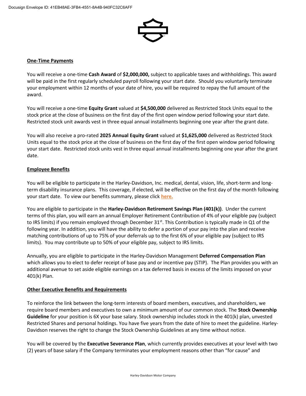 Harley-Davidson Motor Company One-Time Payments You will receive a one-time Cash Award of $2,000,000, subject to applicable taxes and withholdings. This award will be paid in the first regularly scheduled payroll following your start date. Should you voluntarily terminate your employment within 12 months of your date of hire, you will be required to repay the full amount of the award. You will receive a one-time Equity Grant valued at $4,500,000 delivered as Restricted Stock Units equal to the stock price at the close of business on the first day of the first open window period following your start date. Restricted stock unit awards vest in three equal annual installments beginning one year after the grant date. You will also receive a pro-rated 2025 Annual Equity Grant valued at $1,625,000 delivered as Restricted Stock Units equal to the stock price at the close of business on the first day of the first open window period following your start date. Restricted stock units vest in three equal annual installments beginning one year after the grant date. Employee Benefits You will be eligible to participate in the Harley-Davidson, Inc. medical, dental, vision, life, short-term and long- term disability insurance plans. This coverage, if elected, will be effective on the first day of the month following your start date. To view our benefits summary, please click here. You are eligible to participate in the Harley-Davidson Retirement Savings Plan (401(k)). Under the current terms of this plan, you will earn an annual Employer Retirement Contribution of 4% of your eligible pay (subject to IRS limits) if you remain employed through December 31st. This Contribution is typically made in Q1 of the following year. In addition, you will have the ability to defer a portion of your pay into the plan and receive matching contributions of up to 75% of your deferrals up to the first 6% of your eligible pay (subject to IRS limits). You may contribute up to 50% of your eligible pay, subject to IRS limits. Annually, you are eligible to participate in the Harley-Davidson Management Deferred Compensation Plan which allows you to elect to defer receipt of base pay and or incentive pay (STIP). The Plan provides you with an additional avenue to set aside eligible earnings on a tax deferred basis in excess of the limits imposed on your 401(k) Plan. Other Executive Benefits and Requirements To reinforce the link between the long-term interests of board members, executives, and shareholders, we require board members and executives to own a minimum amount of our common stock. The Stock Ownership Guideline for your position is 6X your base salary. Stock ownership includes stock in the 401(k) plan, unvested Restricted Shares and personal holdings. You have five years from the date of hire to meet the guideline. Harley- Davidson reserves the right to change the Stock Ownership Guidelines at any time without notice. You will be covered by the Executive Severance Plan, which currently provides executives at your level with two (2) years of base salary if the Company terminates your employment reasons other than “for cause” and Docusign Envelope ID: 41EB48AE-3FB4-4551-8A4B-940FC32C6AFF