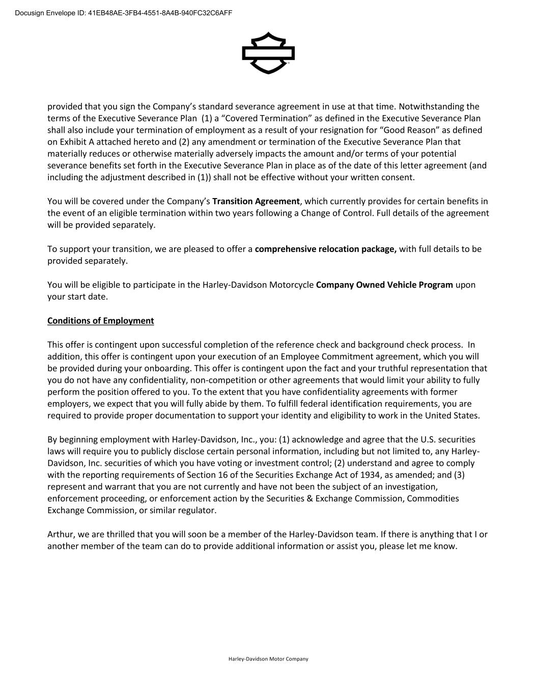 Harley-Davidson Motor Company provided that you sign the Company’s standard severance agreement in use at that time. Notwithstanding the terms of the Executive Severance Plan (1) a “Covered Termination” as defined in the Executive Severance Plan shall also include your termination of employment as a result of your resignation for “Good Reason” as defined on Exhibit A attached hereto and (2) any amendment or termination of the Executive Severance Plan that materially reduces or otherwise materially adversely impacts the amount and/or terms of your potential severance benefits set forth in the Executive Severance Plan in place as of the date of this letter agreement (and including the adjustment described in (1)) shall not be effective without your written consent. You will be covered under the Company’s Transition Agreement, which currently provides for certain benefits in the event of an eligible termination within two years following a Change of Control. Full details of the agreement will be provided separately. To support your transition, we are pleased to offer a comprehensive relocation package, with full details to be provided separately. You will be eligible to participate in the Harley-Davidson Motorcycle Company Owned Vehicle Program upon your start date. Conditions of Employment This offer is contingent upon successful completion of the reference check and background check process. In addition, this offer is contingent upon your execution of an Employee Commitment agreement, which you will be provided during your onboarding. This offer is contingent upon the fact and your truthful representation that you do not have any confidentiality, non-competition or other agreements that would limit your ability to fully perform the position offered to you. To the extent that you have confidentiality agreements with former employers, we expect that you will fully abide by them. To fulfill federal identification requirements, you are required to provide proper documentation to support your identity and eligibility to work in the United States. By beginning employment with Harley-Davidson, Inc., you: (1) acknowledge and agree that the U.S. securities laws will require you to publicly disclose certain personal information, including but not limited to, any Harley- Davidson, Inc. securities of which you have voting or investment control; (2) understand and agree to comply with the reporting requirements of Section 16 of the Securities Exchange Act of 1934, as amended; and (3) represent and warrant that you are not currently and have not been the subject of an investigation, enforcement proceeding, or enforcement action by the Securities & Exchange Commission, Commodities Exchange Commission, or similar regulator. Arthur, we are thrilled that you will soon be a member of the Harley-Davidson team. If there is anything that I or another member of the team can do to provide additional information or assist you, please let me know. Docusign Envelope ID: 41EB48AE-3FB4-4551-8A4B-940FC32C6AFF
