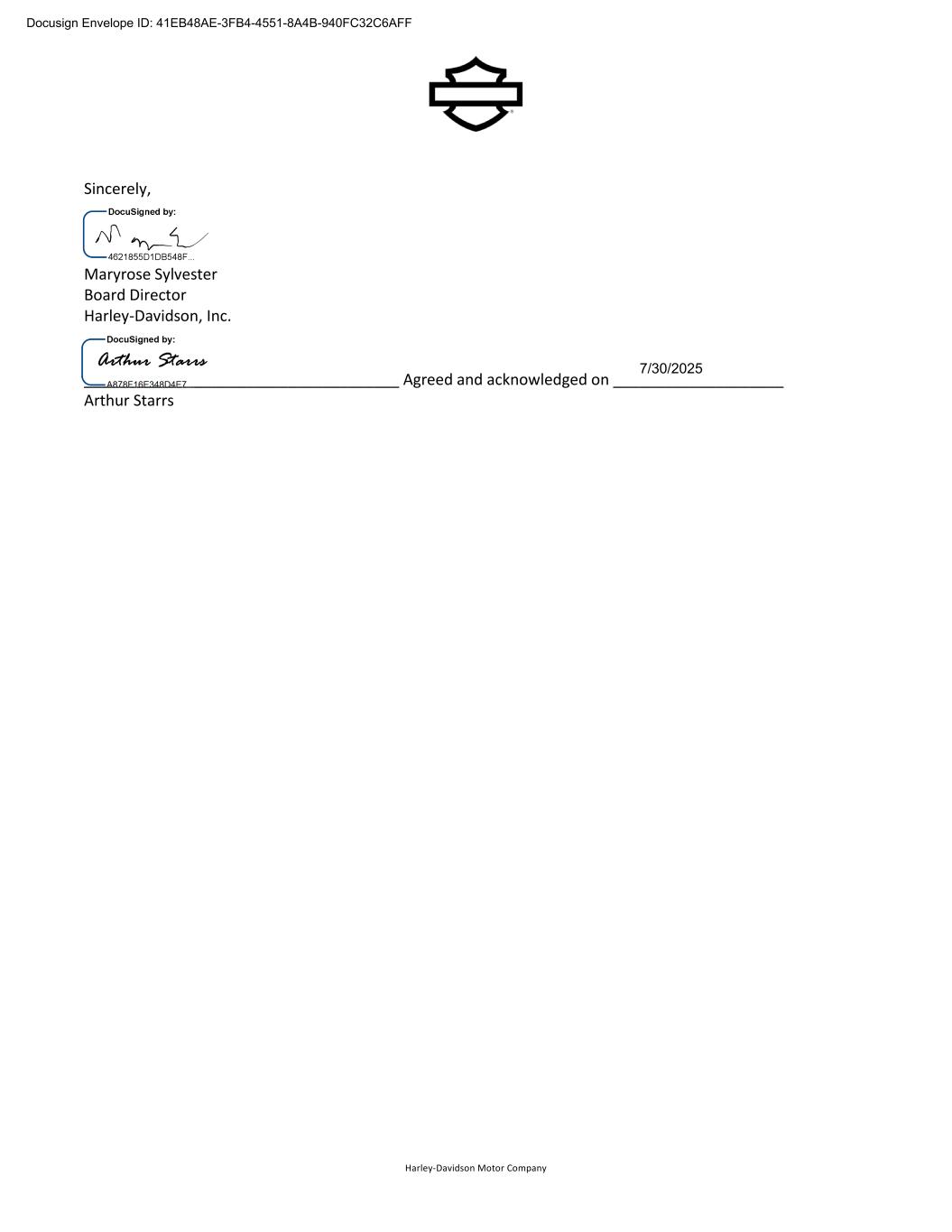 Harley-Davidson Motor Company Sincerely, Maryrose Sylvester Board Director Harley-Davidson, Inc. _____________________________________ Agreed and acknowledged on ____________________ Arthur Starrs Docusign Envelope ID: 41EB48AE-3FB4-4551-8A4B-940FC32C6AFF 7/30/2025