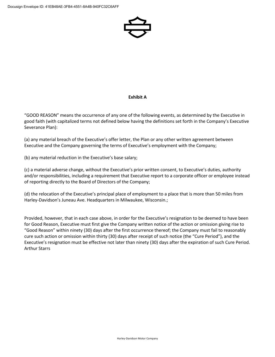 Harley-Davidson Motor Company Exhibit A “GOOD REASON” means the occurrence of any one of the following events, as determined by the Executive in good faith (with capitalized terms not defined below having the definitions set forth in the Company’s Executive Severance Plan): (a) any material breach of the Executive’s offer letter, the Plan or any other written agreement between Executive and the Company governing the terms of Executive’s employment with the Company; (b) any material reduction in the Executive’s base salary; (c) a material adverse change, without the Executive’s prior written consent, to Executive’s duties, authority and/or responsibilities, including a requirement that Executive report to a corporate officer or employee instead of reporting directly to the Board of Directors of the Company; (d) the relocation of the Executive’s principal place of employment to a place that is more than 50 miles from Harley-Davidson’s Juneau Ave. Headquarters in Milwaukee, Wisconsin.; Provided, however, that in each case above, in order for the Executive’s resignation to be deemed to have been for Good Reason, Executive must first give the Company written notice of the action or omission giving rise to “Good Reason” within ninety (30) days after the first occurrence thereof; the Company must fail to reasonably cure such action or omission within thirty (30) days after receipt of such notice (the “Cure Period”), and the Executive’s resignation must be effective not later than ninety (30) days after the expiration of such Cure Period. Arthur Starrs Docusign Envelope ID: 41EB48AE-3FB4-4551-8A4B-940FC32C6AFF