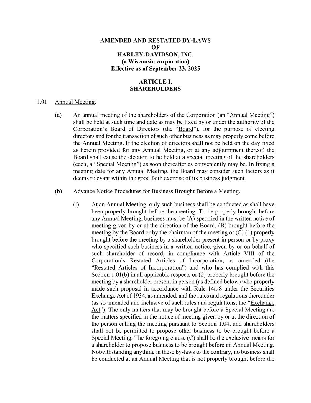 AMENDED AND RESTATED BY-LAWS OF HARLEY-DAVIDSON, INC. (a Wisconsin corporation) Effective as of September 23, 2025 ARTICLE I. SHAREHOLDERS 1.01 Annual Meeting. (a) An annual meeting of the shareholders of the Corporation (an “Annual Meeting”) shall be held at such time and date as may be fixed by or under the authority of the Corporation’s Board of Directors (the “Board”), for the purpose of electing directors and for the transaction of such other business as may properly come before the Annual Meeting. If the election of directors shall not be held on the day fixed as herein provided for any Annual Meeting, or at any adjournment thereof, the Board shall cause the election to be held at a special meeting of the shareholders (each, a “Special Meeting”) as soon thereafter as conveniently may be. In fixing a meeting date for any Annual Meeting, the Board may consider such factors as it deems relevant within the good faith exercise of its business judgment. (b) Advance Notice Procedures for Business Brought Before a Meeting. (i) At an Annual Meeting, only such business shall be conducted as shall have been properly brought before the meeting. To be properly brought before any Annual Meeting, business must be (A) specified in the written notice of meeting given by or at the direction of the Board, (B) brought before the meeting by the Board or by the chairman of the meeting or (C) (1) properly brought before the meeting by a shareholder present in person or by proxy who specified such business in a written notice, given by or on behalf of such shareholder of record, in compliance with Article VIII of the Corporation’s Restated Articles of Incorporation, as amended (the “Restated Articles of Incorporation”) and who has complied with this Section 1.01(b) in all applicable respects or (2) properly brought before the meeting by a shareholder present in person (as defined below) who properly made such proposal in accordance with Rule 14a-8 under the Securities Exchange Act of 1934, as amended, and the rules and regulations thereunder (as so amended and inclusive of such rules and regulations, the “Exchange Act”). The only matters that may be brought before a Special Meeting are the matters specified in the notice of meeting given by or at the direction of the person calling the meeting pursuant to Section 1.04, and shareholders shall not be permitted to propose other business to be brought before a Special Meeting. The foregoing clause (C) shall be the exclusive means for a shareholder to propose business to be brought before an Annual Meeting. Notwithstanding anything in these by-laws to the contrary, no business shall be conducted at an Annual Meeting that is not properly brought before the