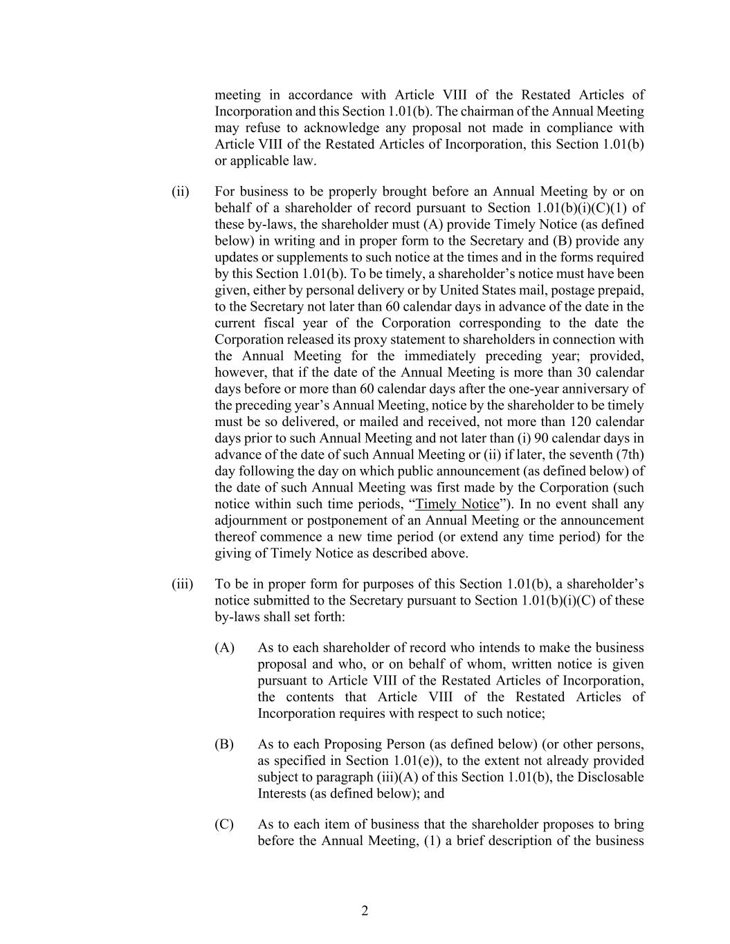 2 meeting in accordance with Article VIII of the Restated Articles of Incorporation and this Section 1.01(b). The chairman of the Annual Meeting may refuse to acknowledge any proposal not made in compliance with Article VIII of the Restated Articles of Incorporation, this Section 1.01(b) or applicable law. (ii) For business to be properly brought before an Annual Meeting by or on behalf of a shareholder of record pursuant to Section 1.01(b)(i)(C)(1) of these by-laws, the shareholder must (A) provide Timely Notice (as defined below) in writing and in proper form to the Secretary and (B) provide any updates or supplements to such notice at the times and in the forms required by this Section 1.01(b). To be timely, a shareholder’s notice must have been given, either by personal delivery or by United States mail, postage prepaid, to the Secretary not later than 60 calendar days in advance of the date in the current fiscal year of the Corporation corresponding to the date the Corporation released its proxy statement to shareholders in connection with the Annual Meeting for the immediately preceding year; provided, however, that if the date of the Annual Meeting is more than 30 calendar days before or more than 60 calendar days after the one-year anniversary of the preceding year’s Annual Meeting, notice by the shareholder to be timely must be so delivered, or mailed and received, not more than 120 calendar days prior to such Annual Meeting and not later than (i) 90 calendar days in advance of the date of such Annual Meeting or (ii) if later, the seventh (7th) day following the day on which public announcement (as defined below) of the date of such Annual Meeting was first made by the Corporation (such notice within such time periods, “Timely Notice”). In no event shall any adjournment or postponement of an Annual Meeting or the announcement thereof commence a new time period (or extend any time period) for the giving of Timely Notice as described above. (iii) To be in proper form for purposes of this Section 1.01(b), a shareholder’s notice submitted to the Secretary pursuant to Section 1.01(b)(i)(C) of these by-laws shall set forth: (A) As to each shareholder of record who intends to make the business proposal and who, or on behalf of whom, written notice is given pursuant to Article VIII of the Restated Articles of Incorporation, the contents that Article VIII of the Restated Articles of Incorporation requires with respect to such notice; (B) As to each Proposing Person (as defined below) (or other persons, as specified in Section 1.01(e)), to the extent not already provided subject to paragraph (iii)(A) of this Section 1.01(b), the Disclosable Interests (as defined below); and (C) As to each item of business that the shareholder proposes to bring before the Annual Meeting, (1) a brief description of the business