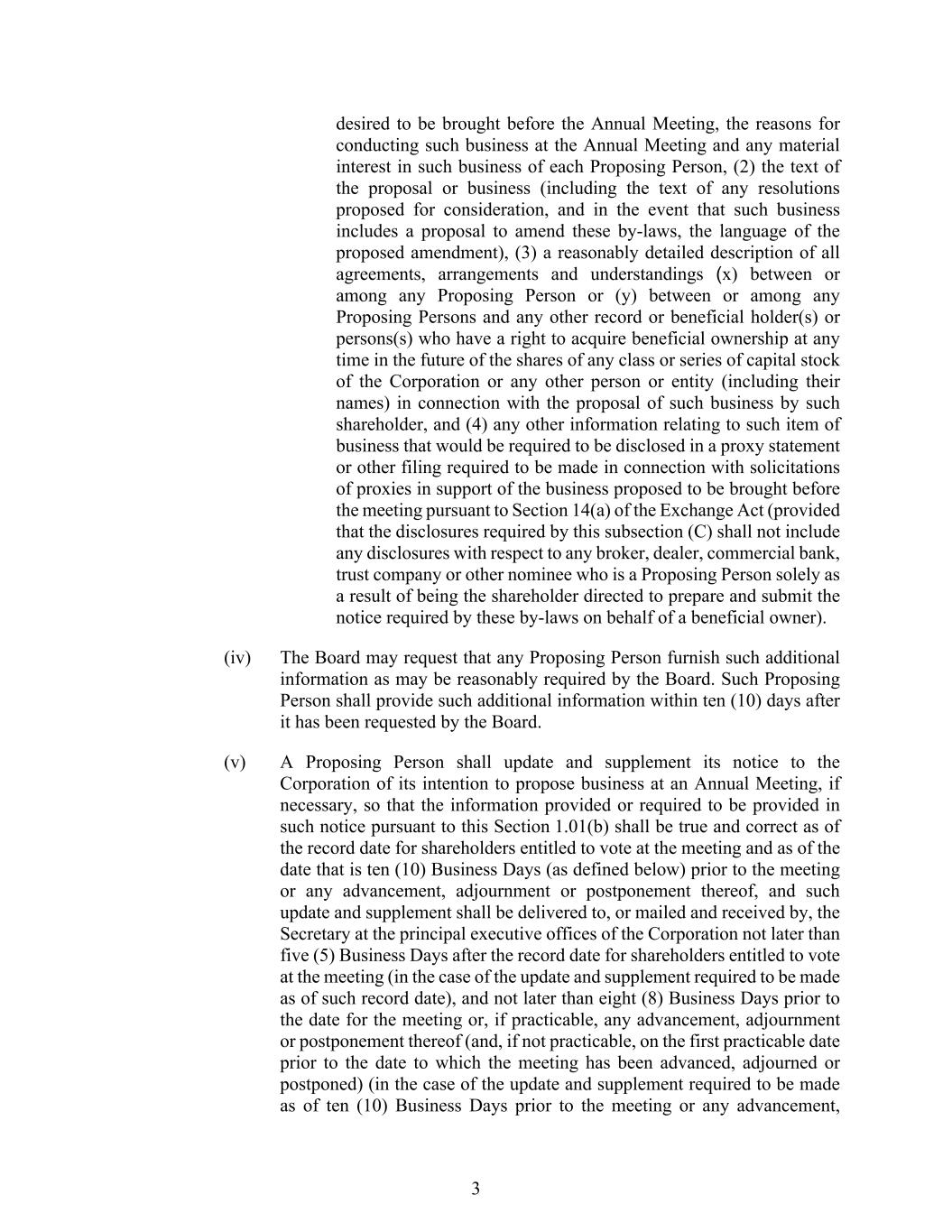 3 desired to be brought before the Annual Meeting, the reasons for conducting such business at the Annual Meeting and any material interest in such business of each Proposing Person, (2) the text of the proposal or business (including the text of any resolutions proposed for consideration, and in the event that such business includes a proposal to amend these by-laws, the language of the proposed amendment), (3) a reasonably detailed description of all agreements, arrangements and understandings (x) between or among any Proposing Person or (y) between or among any Proposing Persons and any other record or beneficial holder(s) or persons(s) who have a right to acquire beneficial ownership at any time in the future of the shares of any class or series of capital stock of the Corporation or any other person or entity (including their names) in connection with the proposal of such business by such shareholder, and (4) any other information relating to such item of business that would be required to be disclosed in a proxy statement or other filing required to be made in connection with solicitations of proxies in support of the business proposed to be brought before the meeting pursuant to Section 14(a) of the Exchange Act (provided that the disclosures required by this subsection (C) shall not include any disclosures with respect to any broker, dealer, commercial bank, trust company or other nominee who is a Proposing Person solely as a result of being the shareholder directed to prepare and submit the notice required by these by-laws on behalf of a beneficial owner). (iv) The Board may request that any Proposing Person furnish such additional information as may be reasonably required by the Board. Such Proposing Person shall provide such additional information within ten (10) days after it has been requested by the Board. (v) A Proposing Person shall update and supplement its notice to the Corporation of its intention to propose business at an Annual Meeting, if necessary, so that the information provided or required to be provided in such notice pursuant to this Section 1.01(b) shall be true and correct as of the record date for shareholders entitled to vote at the meeting and as of the date that is ten (10) Business Days (as defined below) prior to the meeting or any advancement, adjournment or postponement thereof, and such update and supplement shall be delivered to, or mailed and received by, the Secretary at the principal executive offices of the Corporation not later than five (5) Business Days after the record date for shareholders entitled to vote at the meeting (in the case of the update and supplement required to be made as of such record date), and not later than eight (8) Business Days prior to the date for the meeting or, if practicable, any advancement, adjournment or postponement thereof (and, if not practicable, on the first practicable date prior to the date to which the meeting has been advanced, adjourned or postponed) (in the case of the update and supplement required to be made as of ten (10) Business Days prior to the meeting or any advancement,