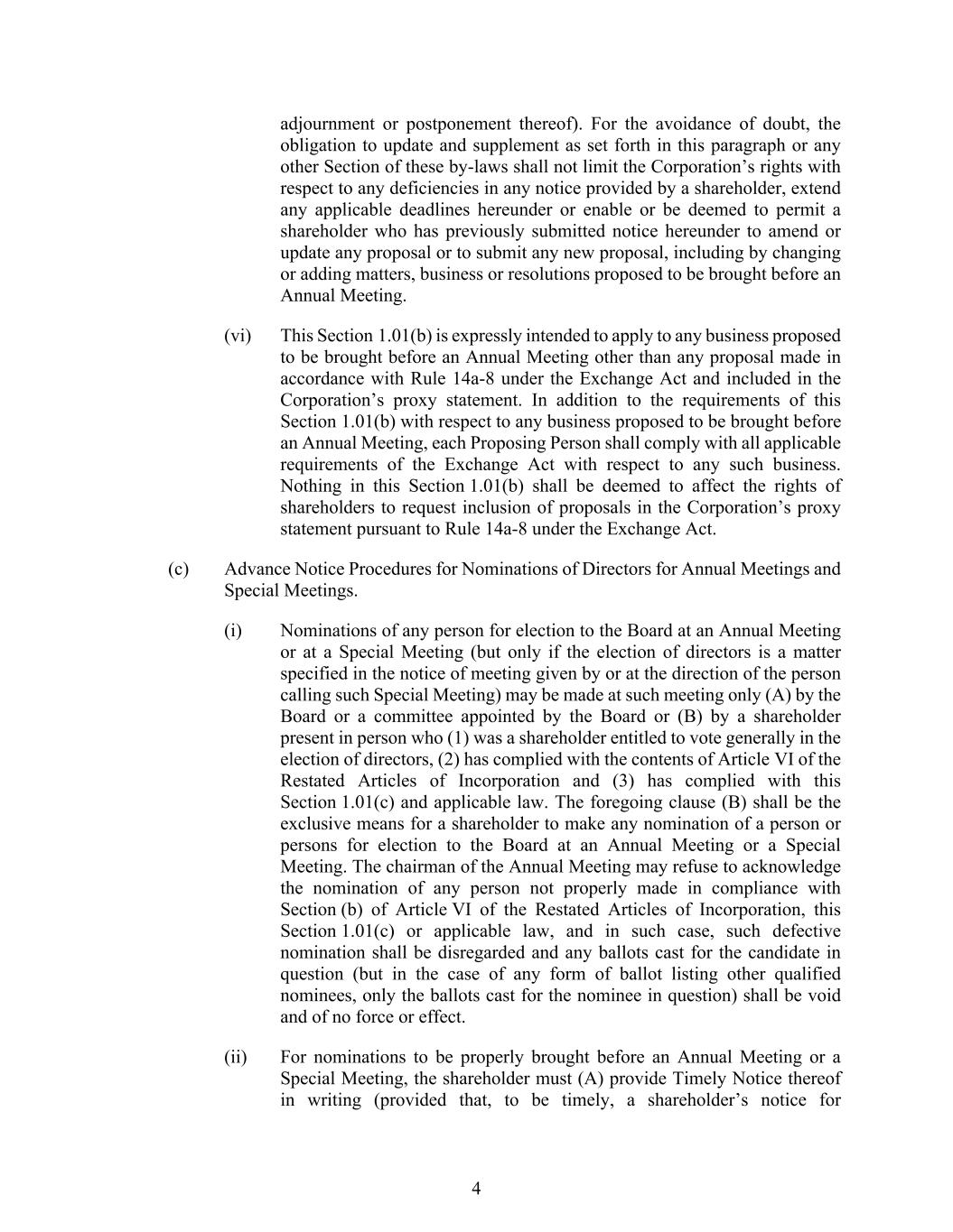 4 adjournment or postponement thereof). For the avoidance of doubt, the obligation to update and supplement as set forth in this paragraph or any other Section of these by-laws shall not limit the Corporation’s rights with respect to any deficiencies in any notice provided by a shareholder, extend any applicable deadlines hereunder or enable or be deemed to permit a shareholder who has previously submitted notice hereunder to amend or update any proposal or to submit any new proposal, including by changing or adding matters, business or resolutions proposed to be brought before an Annual Meeting. (vi) This Section 1.01(b) is expressly intended to apply to any business proposed to be brought before an Annual Meeting other than any proposal made in accordance with Rule 14a-8 under the Exchange Act and included in the Corporation’s proxy statement. In addition to the requirements of this Section 1.01(b) with respect to any business proposed to be brought before an Annual Meeting, each Proposing Person shall comply with all applicable requirements of the Exchange Act with respect to any such business. Nothing in this Section 1.01(b) shall be deemed to affect the rights of shareholders to request inclusion of proposals in the Corporation’s proxy statement pursuant to Rule 14a-8 under the Exchange Act. (c) Advance Notice Procedures for Nominations of Directors for Annual Meetings and Special Meetings. (i) Nominations of any person for election to the Board at an Annual Meeting or at a Special Meeting (but only if the election of directors is a matter specified in the notice of meeting given by or at the direction of the person calling such Special Meeting) may be made at such meeting only (A) by the Board or a committee appointed by the Board or (B) by a shareholder present in person who (1) was a shareholder entitled to vote generally in the election of directors, (2) has complied with the contents of Article VI of the Restated Articles of Incorporation and (3) has complied with this Section 1.01(c) and applicable law. The foregoing clause (B) shall be the exclusive means for a shareholder to make any nomination of a person or persons for election to the Board at an Annual Meeting or a Special Meeting. The chairman of the Annual Meeting may refuse to acknowledge the nomination of any person not properly made in compliance with Section (b) of Article VI of the Restated Articles of Incorporation, this Section 1.01(c) or applicable law, and in such case, such defective nomination shall be disregarded and any ballots cast for the candidate in question (but in the case of any form of ballot listing other qualified nominees, only the ballots cast for the nominee in question) shall be void and of no force or effect. (ii) For nominations to be properly brought before an Annual Meeting or a Special Meeting, the shareholder must (A) provide Timely Notice thereof in writing (provided that, to be timely, a shareholder’s notice for