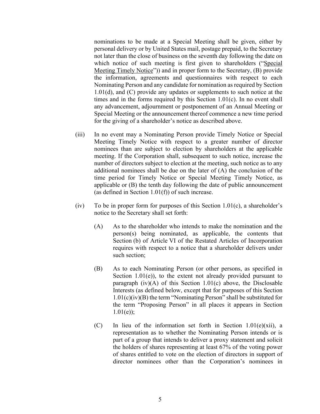 5 nominations to be made at a Special Meeting shall be given, either by personal delivery or by United States mail, postage prepaid, to the Secretary not later than the close of business on the seventh day following the date on which notice of such meeting is first given to shareholders (“Special Meeting Timely Notice”)) and in proper form to the Secretary, (B) provide the information, agreements and questionnaires with respect to each Nominating Person and any candidate for nomination as required by Section 1.01(d), and (C) provide any updates or supplements to such notice at the times and in the forms required by this Section 1.01(c). In no event shall any advancement, adjournment or postponement of an Annual Meeting or Special Meeting or the announcement thereof commence a new time period for the giving of a shareholder’s notice as described above. (iii) In no event may a Nominating Person provide Timely Notice or Special Meeting Timely Notice with respect to a greater number of director nominees than are subject to election by shareholders at the applicable meeting. If the Corporation shall, subsequent to such notice, increase the number of directors subject to election at the meeting, such notice as to any additional nominees shall be due on the later of (A) the conclusion of the time period for Timely Notice or Special Meeting Timely Notice, as applicable or (B) the tenth day following the date of public announcement (as defined in Section 1.01(f)) of such increase. (iv) To be in proper form for purposes of this Section 1.01(c), a shareholder’s notice to the Secretary shall set forth: (A) As to the shareholder who intends to make the nomination and the person(s) being nominated, as applicable, the contents that Section (b) of Article VI of the Restated Articles of Incorporation requires with respect to a notice that a shareholder delivers under such section; (B) As to each Nominating Person (or other persons, as specified in Section 1.01(e)), to the extent not already provided pursuant to paragraph (iv)(A) of this Section 1.01(c) above, the Disclosable Interests (as defined below, except that for purposes of this Section 1.01(c)(iv)(B) the term “Nominating Person” shall be substituted for the term “Proposing Person” in all places it appears in Section 1.01(e)); (C) In lieu of the information set forth in Section 1.01(e)(xii), a representation as to whether the Nominating Person intends or is part of a group that intends to deliver a proxy statement and solicit the holders of shares representing at least 67% of the voting power of shares entitled to vote on the election of directors in support of director nominees other than the Corporation’s nominees in