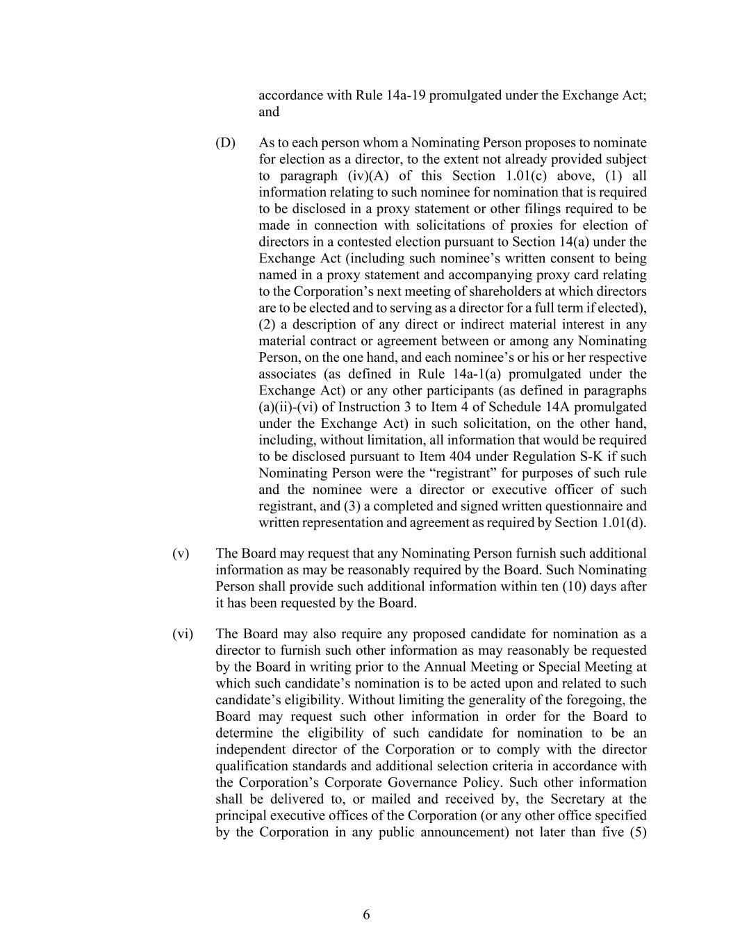 6 accordance with Rule 14a-19 promulgated under the Exchange Act; and (D) As to each person whom a Nominating Person proposes to nominate for election as a director, to the extent not already provided subject to paragraph (iv)(A) of this Section 1.01(c) above, (1) all information relating to such nominee for nomination that is required to be disclosed in a proxy statement or other filings required to be made in connection with solicitations of proxies for election of directors in a contested election pursuant to Section 14(a) under the Exchange Act (including such nominee’s written consent to being named in a proxy statement and accompanying proxy card relating to the Corporation’s next meeting of shareholders at which directors are to be elected and to serving as a director for a full term if elected), (2) a description of any direct or indirect material interest in any material contract or agreement between or among any Nominating Person, on the one hand, and each nominee’s or his or her respective associates (as defined in Rule 14a-1(a) promulgated under the Exchange Act) or any other participants (as defined in paragraphs (a)(ii)-(vi) of Instruction 3 to Item 4 of Schedule 14A promulgated under the Exchange Act) in such solicitation, on the other hand, including, without limitation, all information that would be required to be disclosed pursuant to Item 404 under Regulation S-K if such Nominating Person were the “registrant” for purposes of such rule and the nominee were a director or executive officer of such registrant, and (3) a completed and signed written questionnaire and written representation and agreement as required by Section 1.01(d). (v) The Board may request that any Nominating Person furnish such additional information as may be reasonably required by the Board. Such Nominating Person shall provide such additional information within ten (10) days after it has been requested by the Board. (vi) The Board may also require any proposed candidate for nomination as a director to furnish such other information as may reasonably be requested by the Board in writing prior to the Annual Meeting or Special Meeting at which such candidate’s nomination is to be acted upon and related to such candidate’s eligibility. Without limiting the generality of the foregoing, the Board may request such other information in order for the Board to determine the eligibility of such candidate for nomination to be an independent director of the Corporation or to comply with the director qualification standards and additional selection criteria in accordance with the Corporation’s Corporate Governance Policy. Such other information shall be delivered to, or mailed and received by, the Secretary at the principal executive offices of the Corporation (or any other office specified by the Corporation in any public announcement) not later than five (5)